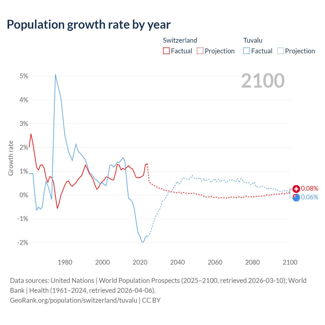 - For the last 10 years, Switzerland has had an average growth rate of +0.98% per year vs -1.19% in Tuvalu.
