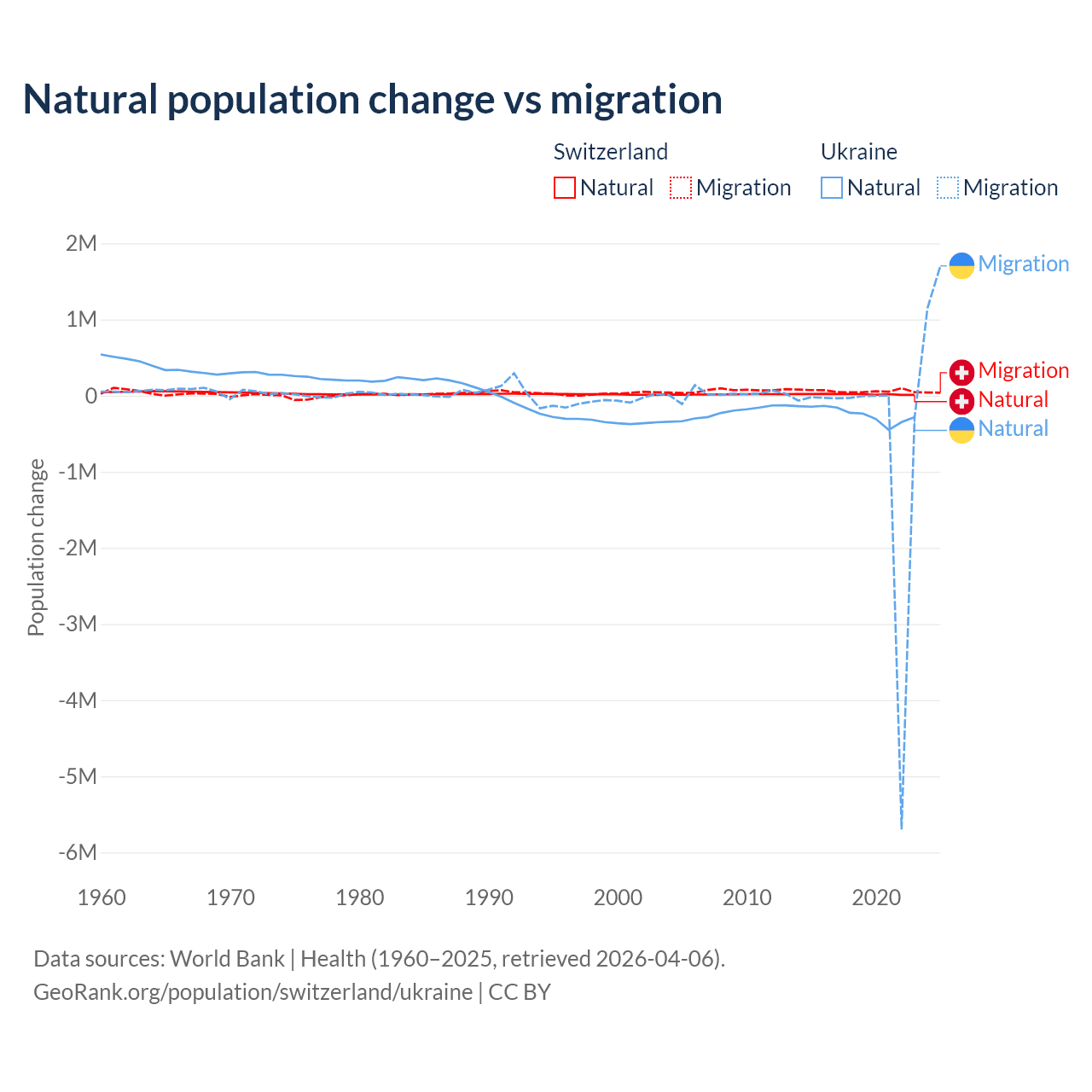 Over the last 10 years, 21.6% of the population change in Switzerland is from natural causes (a gain of 165,354 people) and 78.4% is from migration (a gain of 600,145 people). In Ukraine 28.2% is from natural causes (a loss of 2,435,153 people) and 71.8% is from migration (a loss of 6,198,995 people).