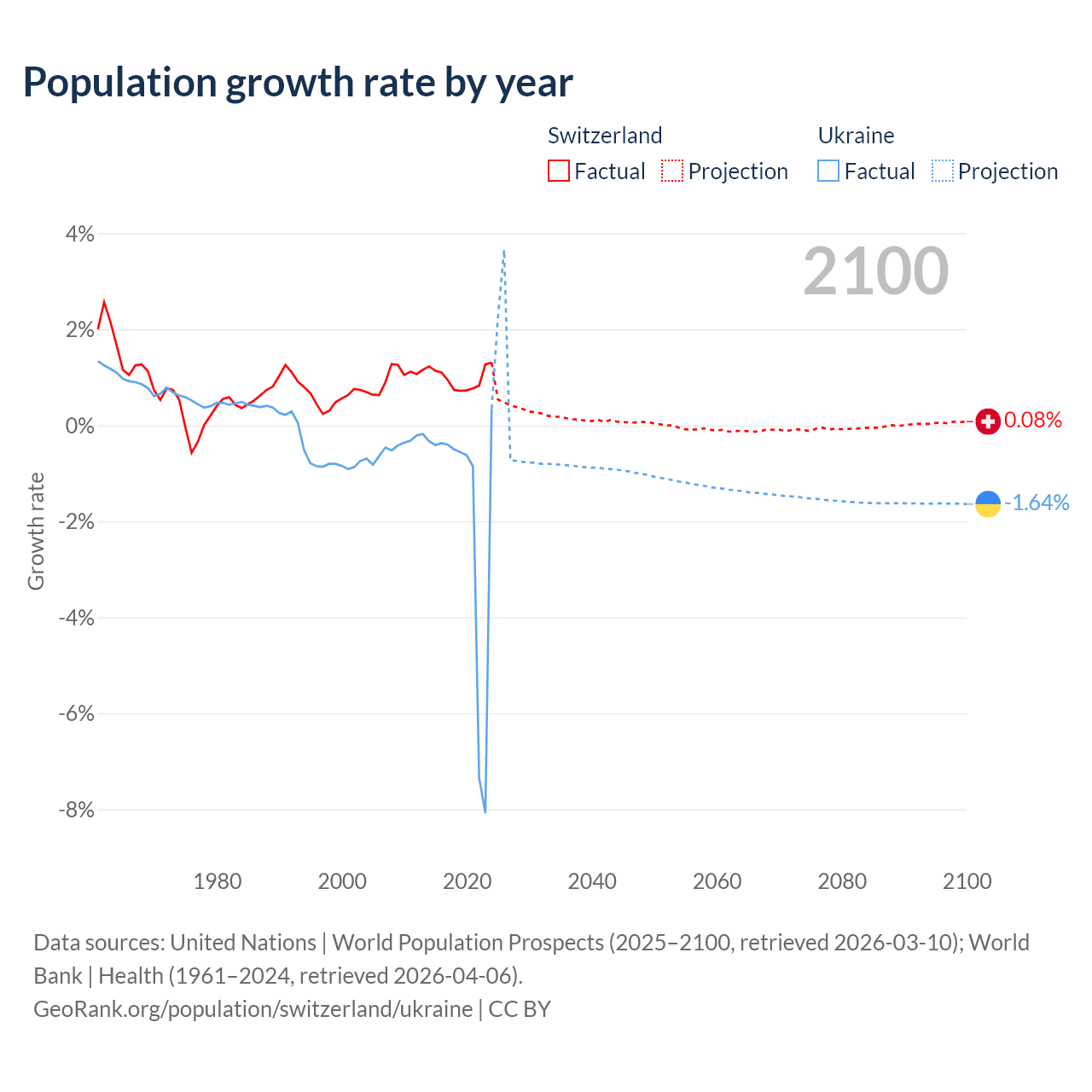 - For the last 10 years, Switzerland has had an average growth rate of +0.98% per year vs -1.74% in Ukraine.