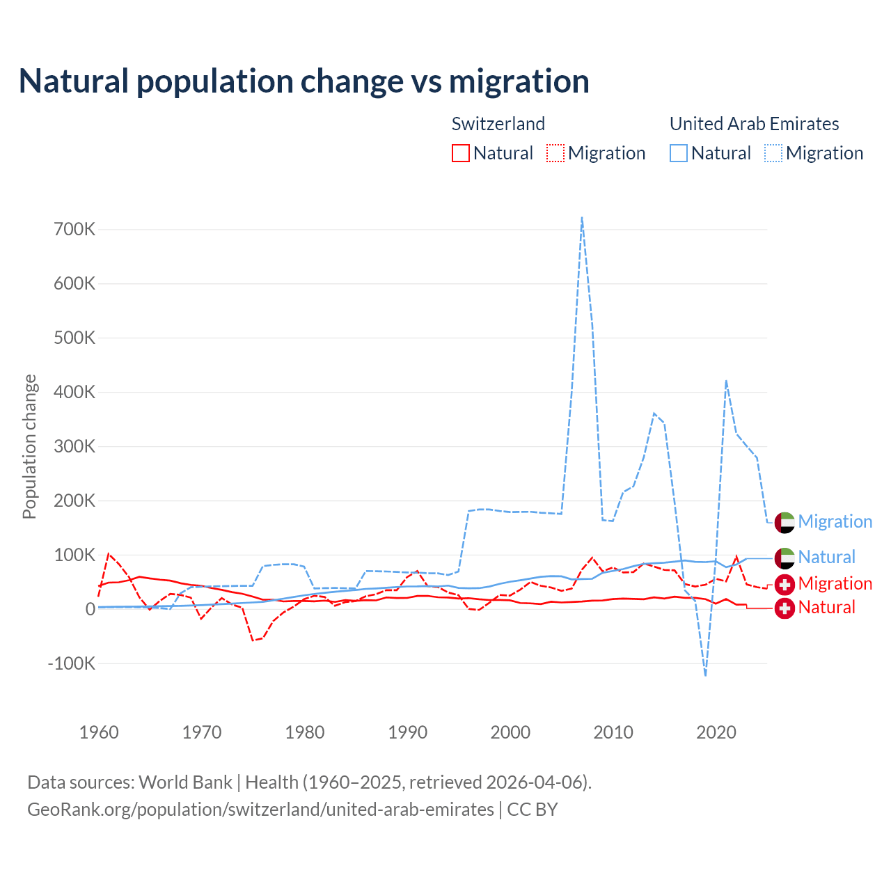 Over the last 10 years, 21.6% of the population change in Switzerland is from natural causes (a gain of 165,354 people) and 78.4% is from migration (a gain of 600,145 people). In the United Arab Emirates 30.5% is from natural causes (a gain of 857,996 people) and 69.5% is from migration (a gain of 1,958,520 people).