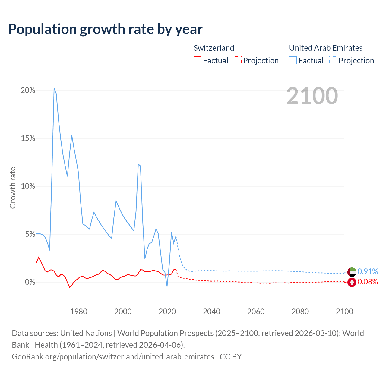 - For the last 10 years, Switzerland has had an average growth rate of +0.98% per year vs +3.31% in the United Arab Emirates.