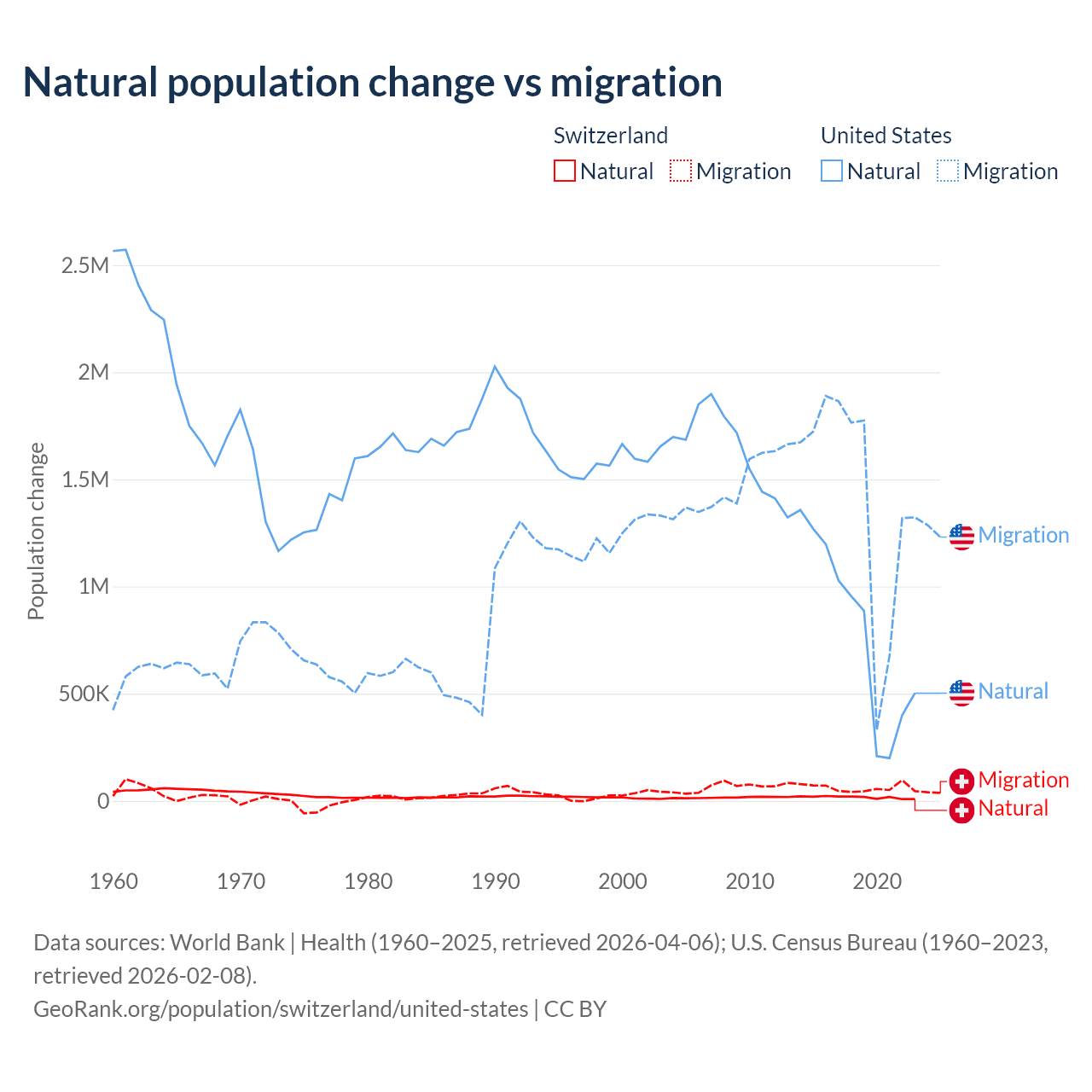 Over the last 10 years, 21.6% of the population change in Switzerland is from natural causes (a gain of 165,354 people) and 78.4% is from migration (a gain of 600,145 people). In the United States 35.8% is from natural causes (a gain of 8,005,866 people) and 64.2% is from migration (a gain of 14,334,286 people).