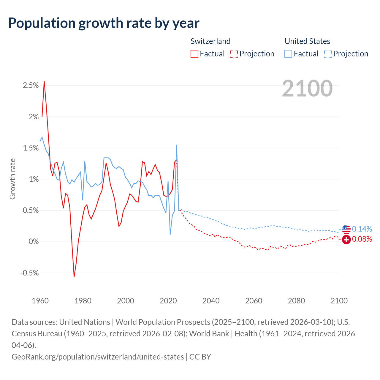 - For the last 10 years, Switzerland has had an average growth rate of +0.98% per year vs +0.65% in the United States.