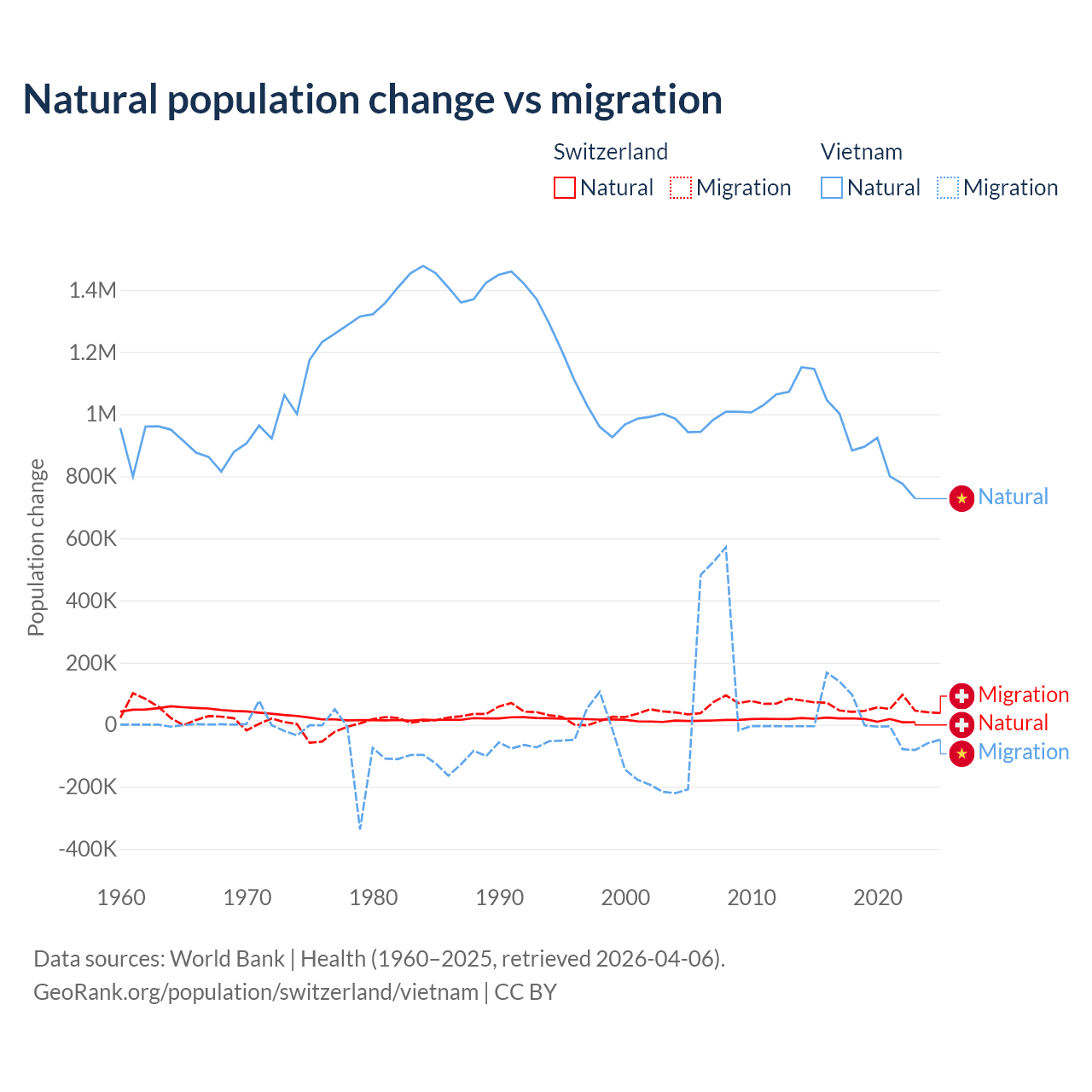 Over the last 10 years, 21.6% of the population change in Switzerland is from natural causes (a gain of 165,354 people) and 78.4% is from migration (a gain of 600,145 people). In Vietnam 97.7% is from natural causes (a gain of 9,349,756 people) and 2.29% is from migration (a gain of 219,073 people).