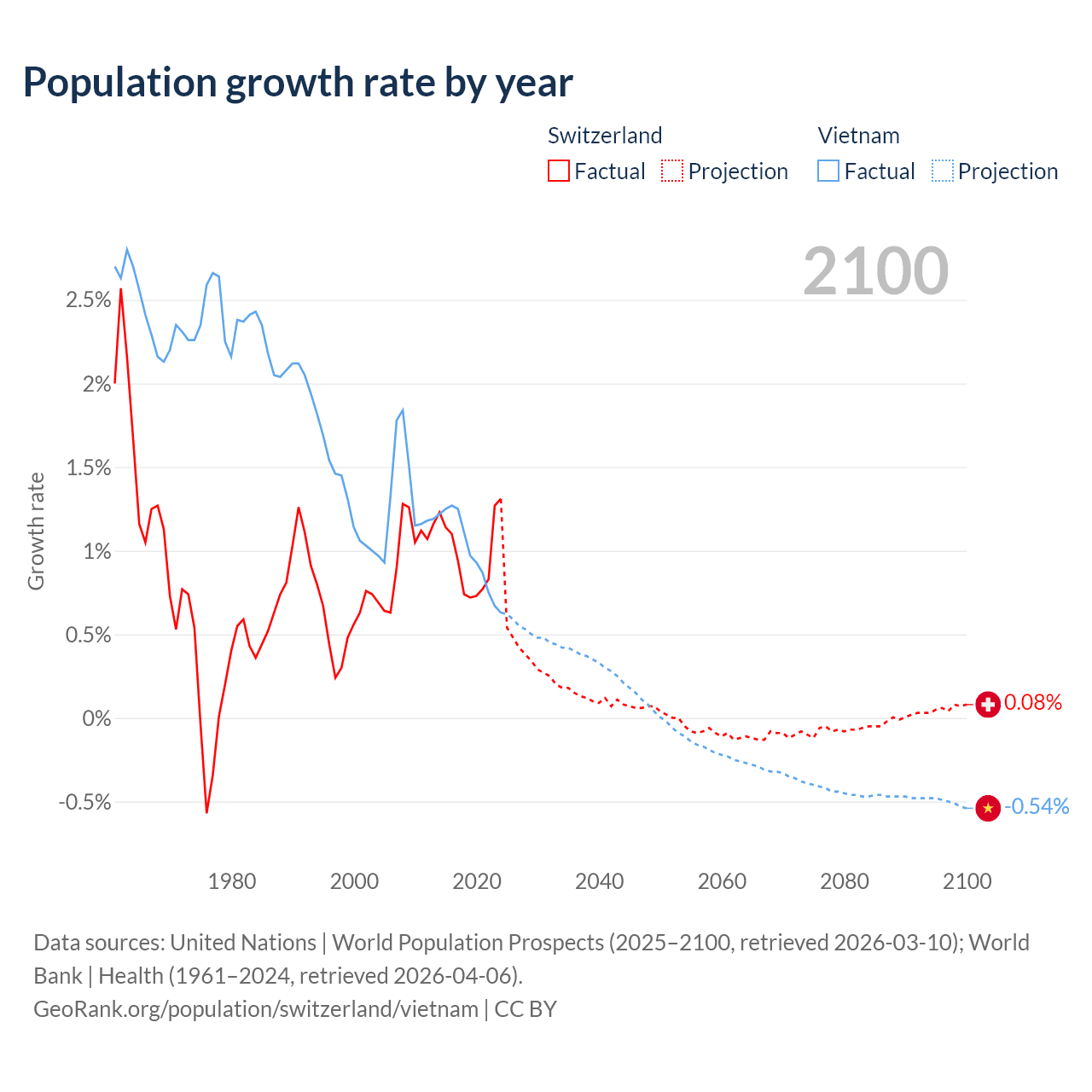 - For the last 10 years, Switzerland has had an average growth rate of +0.98% per year vs +0.99% in Vietnam.