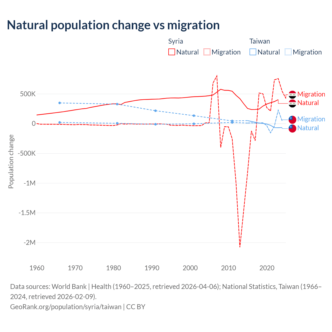 Over the last 10 years, 91.3% of the population change in Syria is from natural causes (a gain of 3,047,621 people) and 8.72% is from migration (a gain of 291,069 people). In Taiwan 56.7% is from natural causes (a loss of 57,467 people) and 43.3% is from migration (a gain of 43,884 people).