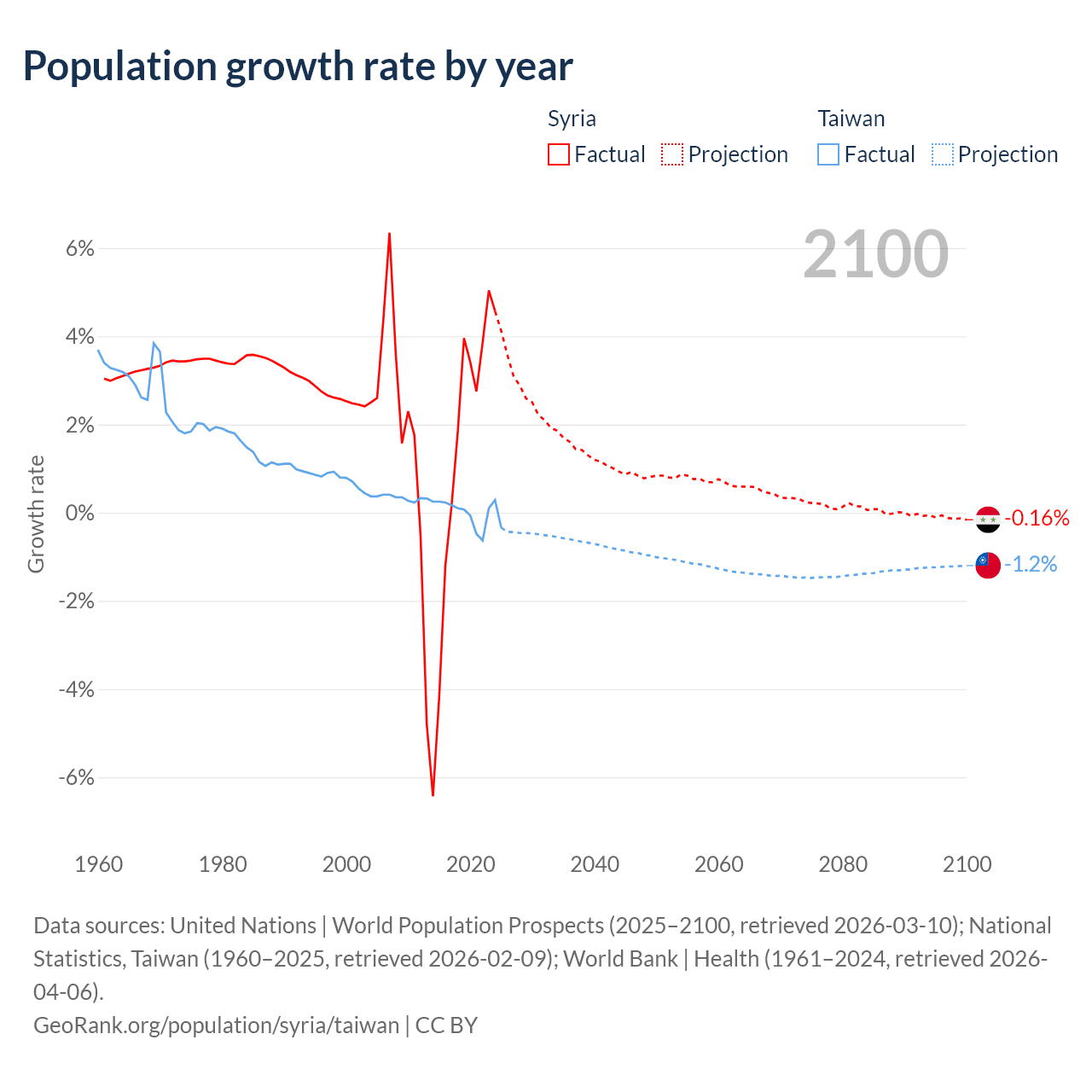 - For the last 10 years, Syria has had an average growth rate of +1.25% per year vs -0.03% in Taiwan.