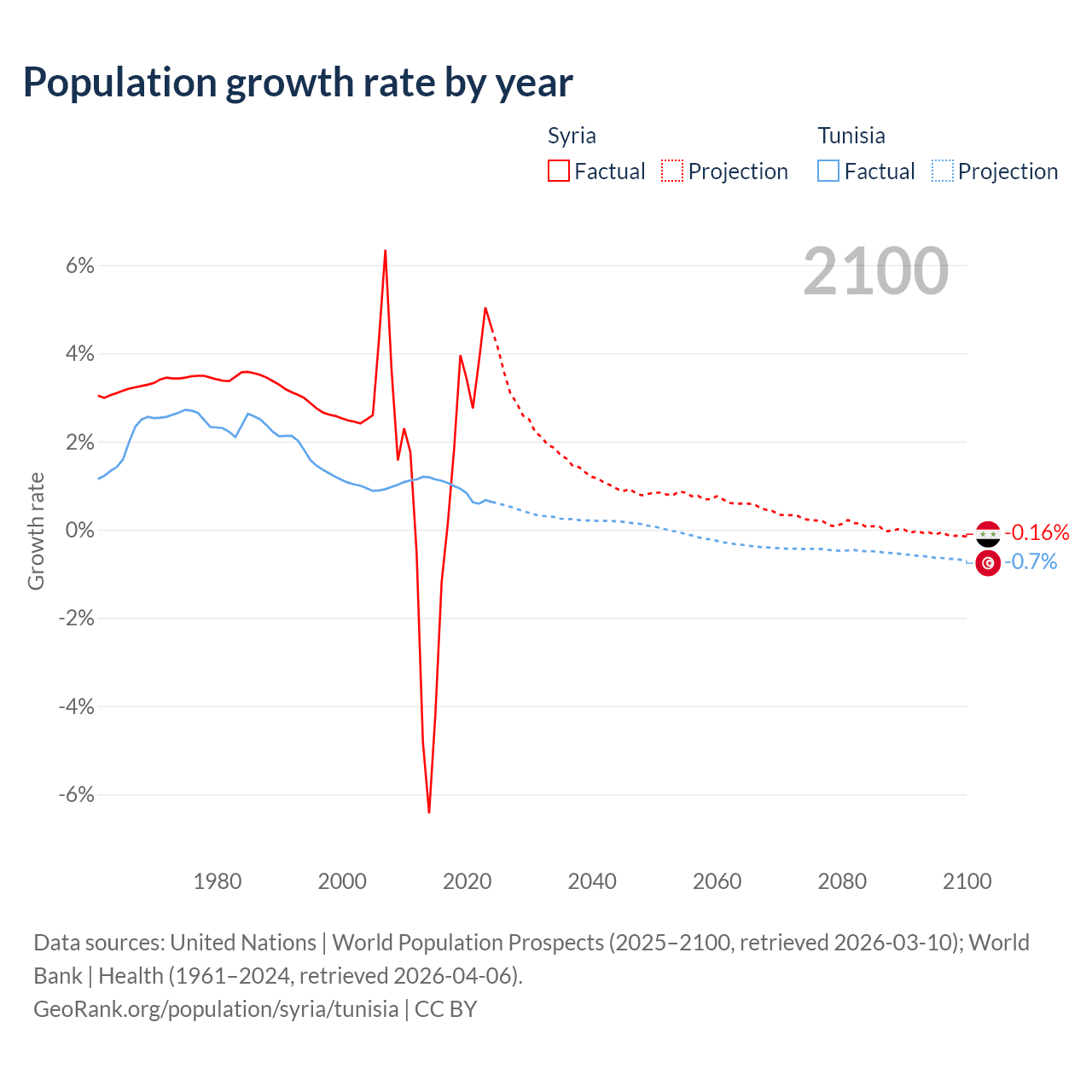 - For the last 10 years, Syria has had an average growth rate of +1.25% per year vs +0.89% in Tunisia.