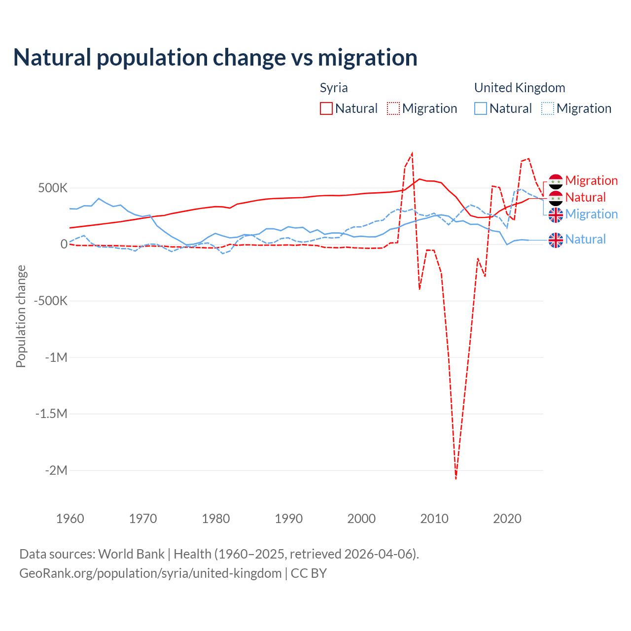 Over the last 10 years, 91.3% of the population change in Syria is from natural causes (a gain of 3,047,621 people) and 8.72% is from migration (a gain of 291,069 people). In the United Kingdom 23.9% is from natural causes (a gain of 1,033,129 people) and 76.1% is from migration (a gain of 3,283,101 people).