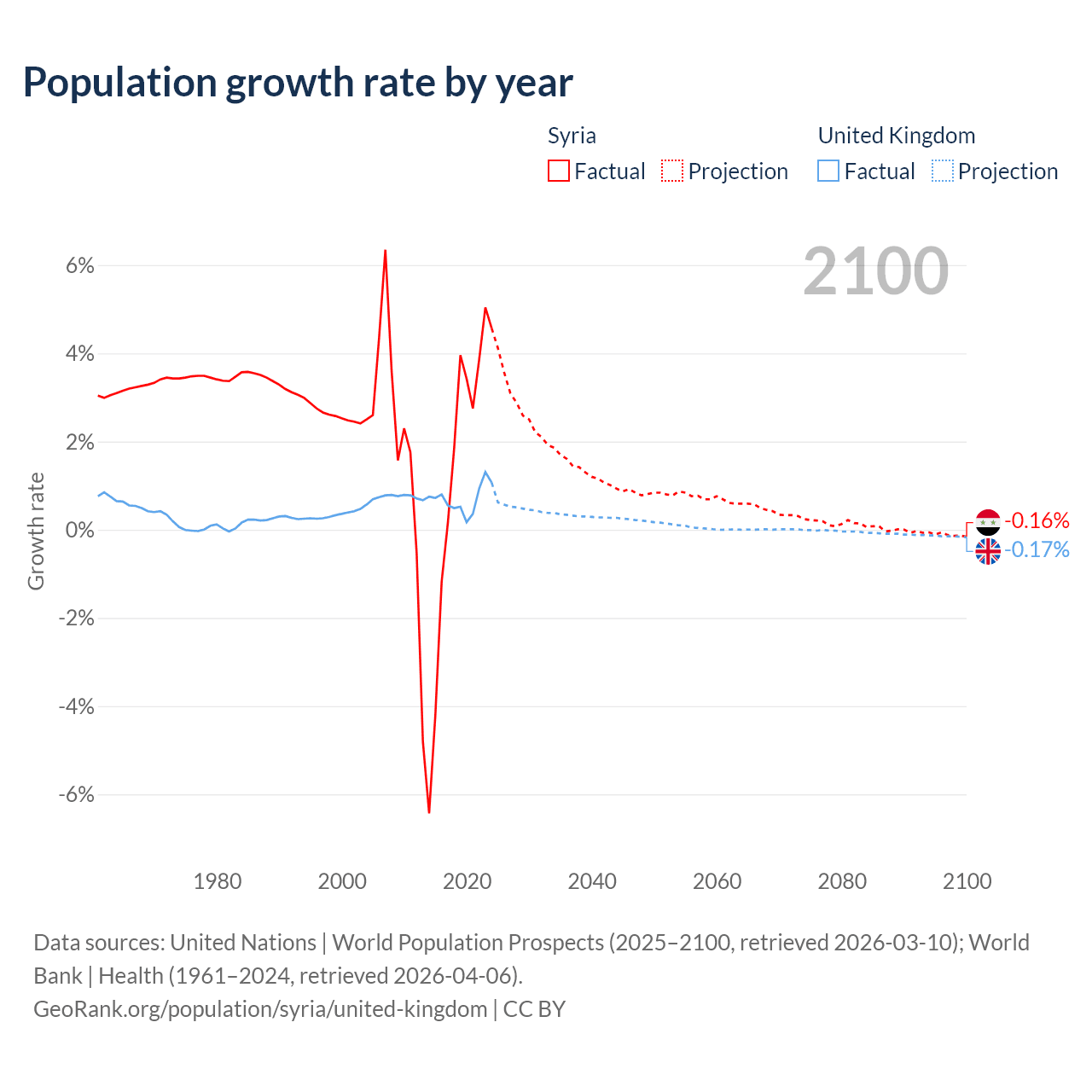 - For the last 10 years, Syria has had an average growth rate of +1.25% per year vs +0.7% in the United Kingdom.
