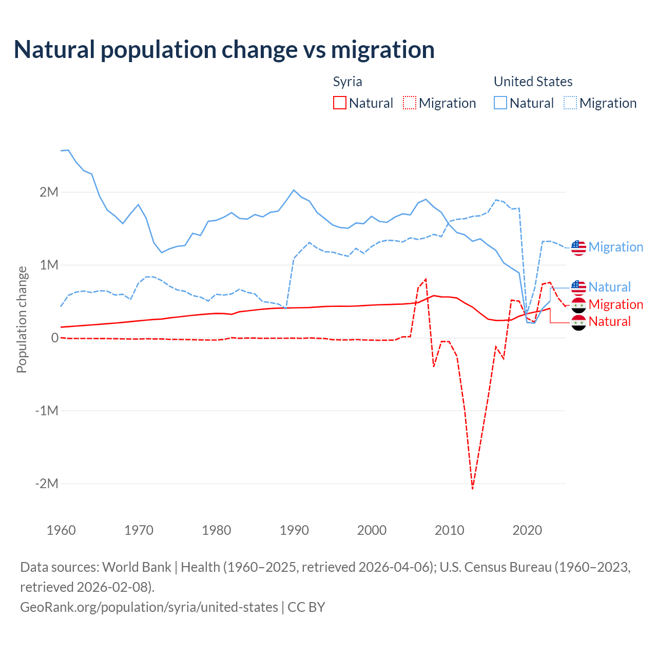 Data sources: World Bank | Health (1960–2025, retrieved 2026-04-06); U.S. Census Bureau (1960–2023, retrieved 2026-02-08).