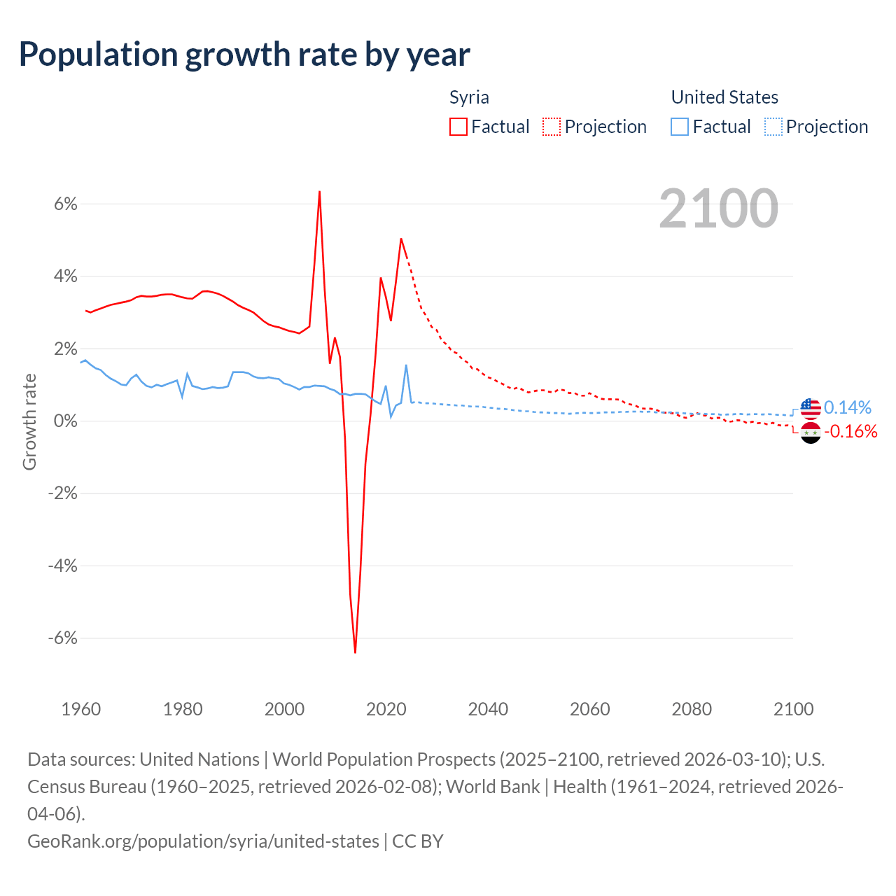 Data sources: World Bank | Health (1960–2024, retrieved 2026-04-06); United Nations | World Population Prospects (1960–2026, retrieved 2026-03-10); U.S. Census Bureau (1960–2025, retrieved 2026-02-08); Central Intelligence Agency (CIA) (2000–2019, retrieved 2026-02-20).