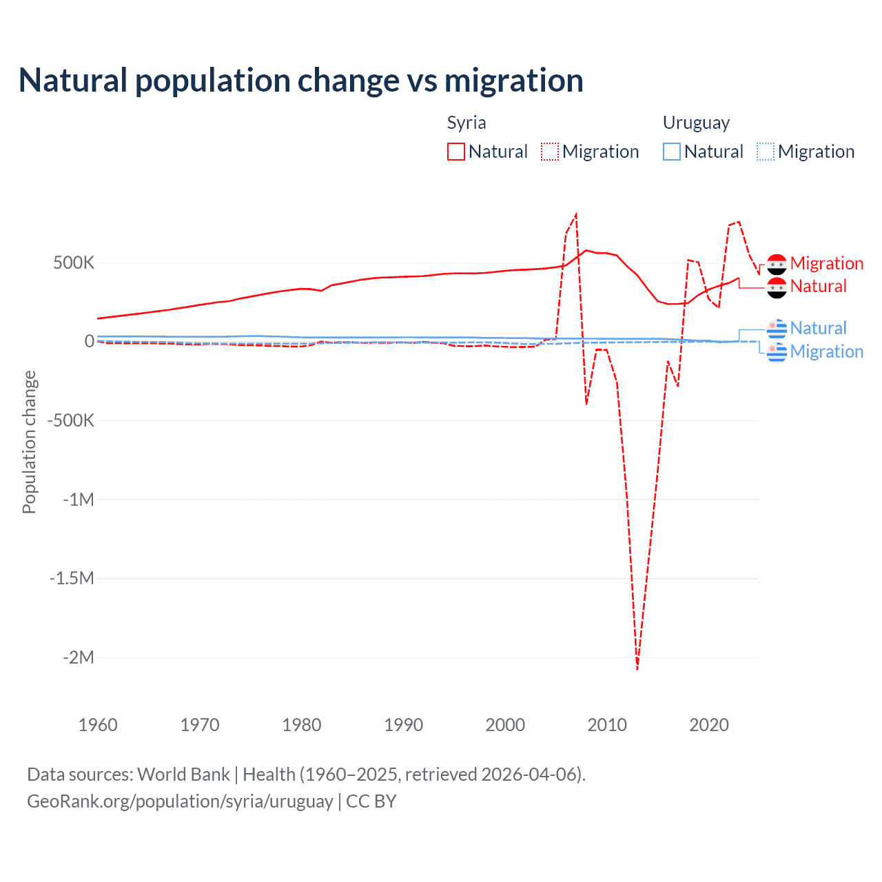 Over the last 10 years, 91.3% of the population change in Syria is from natural causes (a gain of 3,047,621 people) and 8.72% is from migration (a gain of 291,069 people). In Uruguay 70% is from natural causes (a gain of 64,303 people) and 30% is from migration (a loss of 27,501 people).