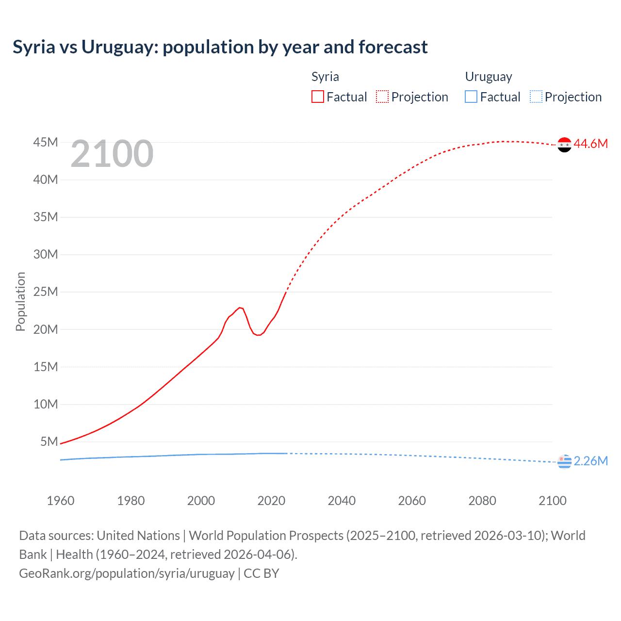 The latest officially reported population of Syria was 24,672,760 in 2024 vs 3,386,588 people in Uruguay in 2024. In 2026, based on the adjusted UN estimation, the current Syria's population is 26,829,400 people compared to 3,382,789 in Uruguay.