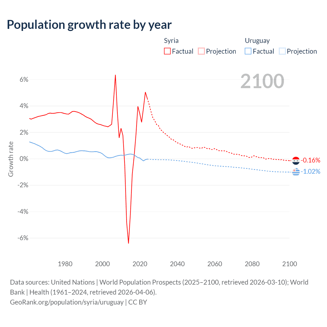 - For the last 10 years, Syria has had an average growth rate of +1.25% per year vs +0.11% in Uruguay.