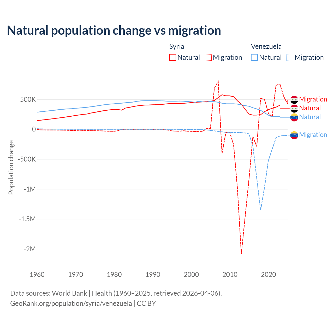 Over the last 10 years, 91.3% of the population change in Syria is from natural causes (a gain of 3,047,621 people) and 8.72% is from migration (a gain of 291,069 people). In Venezuela 38.6% is from natural causes (a gain of 2,946,257 people) and 61.4% is from migration (a loss of 4,683,227 people).
