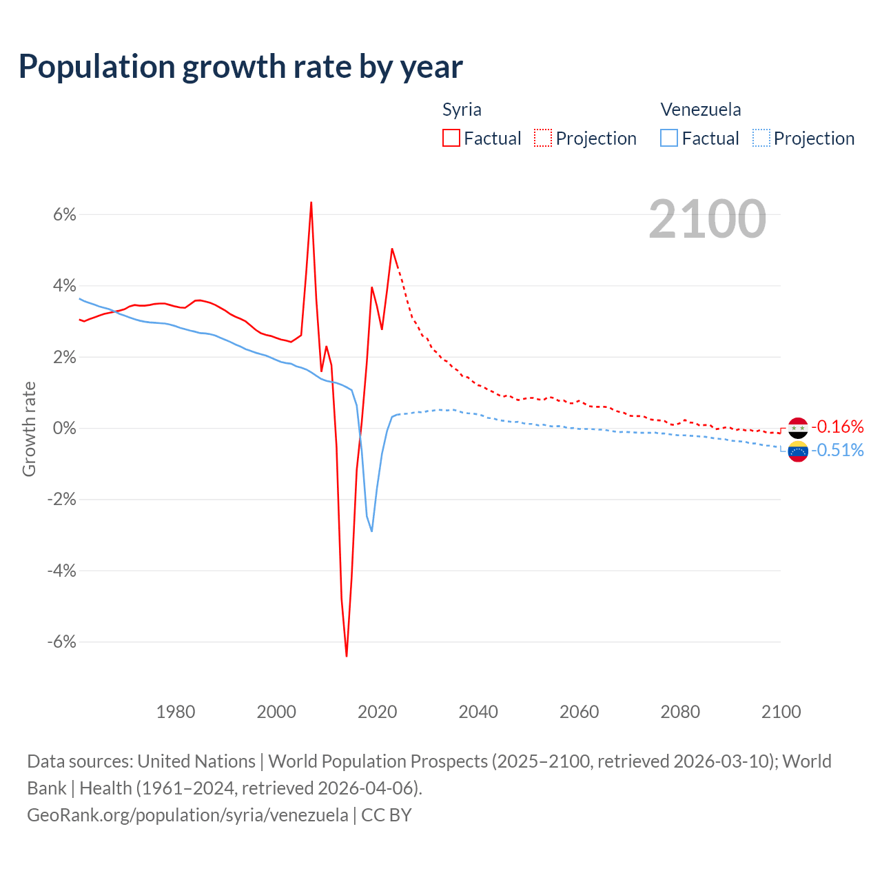 - For the last 10 years, Syria has had an average growth rate of +1.25% per year vs -0.46% in Venezuela.