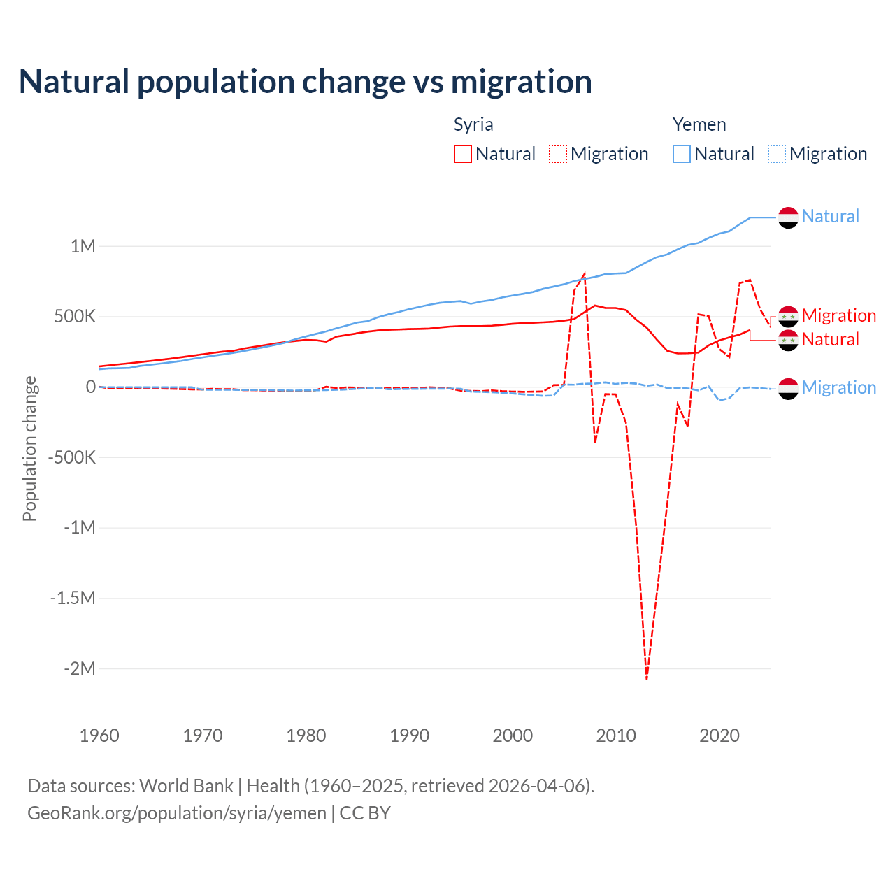 Over the last 10 years, 91.3% of the population change in Syria is from natural causes (a gain of 3,047,621 people) and 8.72% is from migration (a gain of 291,069 people). In Yemen 97.8% is from natural causes (a gain of 10,460,813 people) and 2.17% is from migration (a loss of 231,814 people).