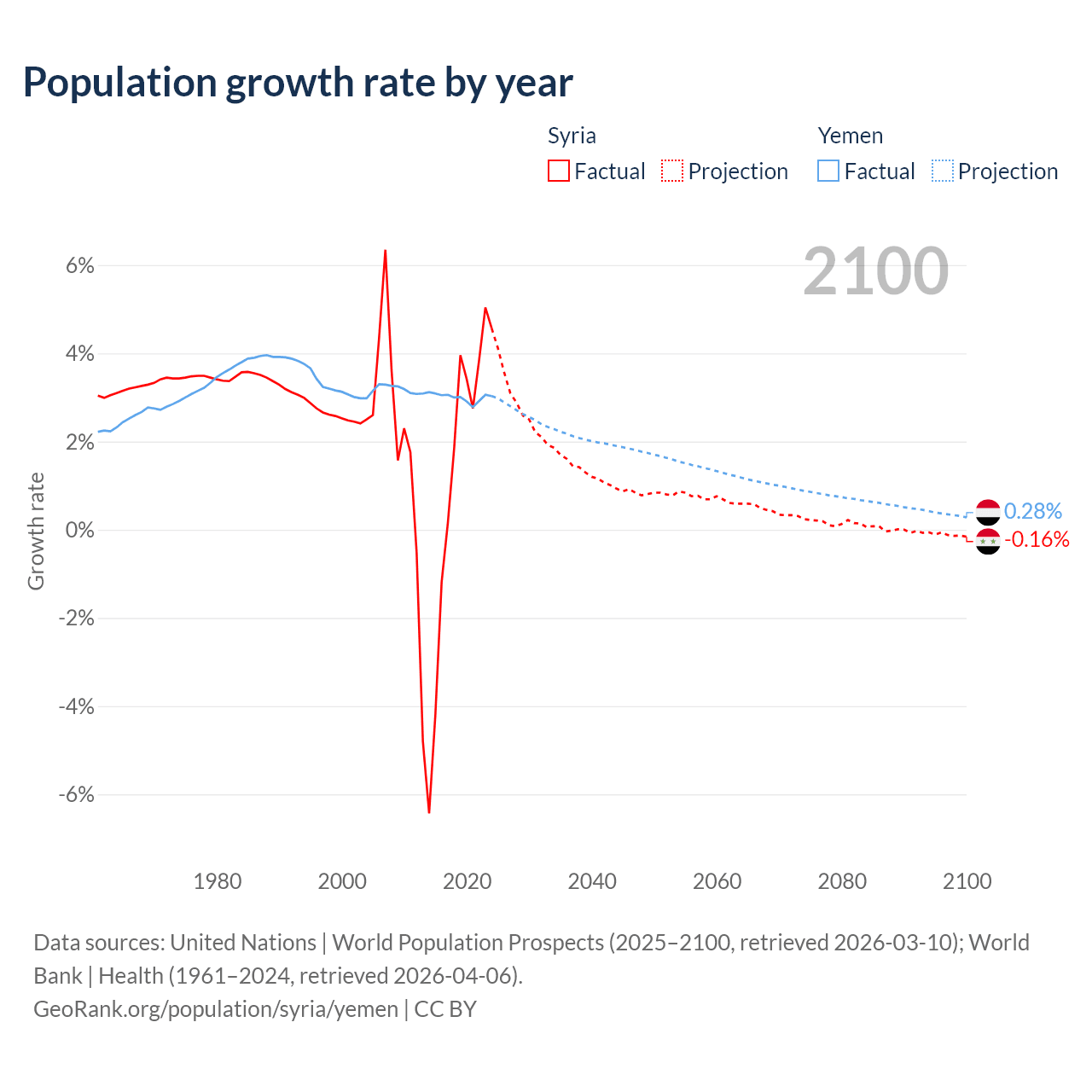 - For the last 10 years, Syria has had an average growth rate of +1.25% per year vs +3% in Yemen.