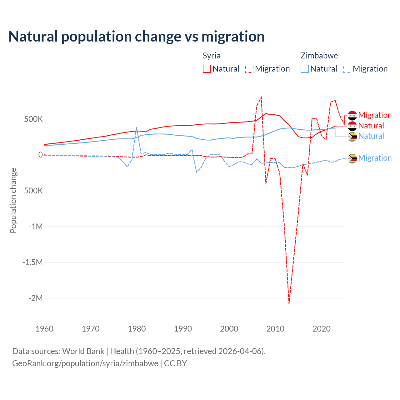 Over the last 10 years, 91.3% of the population change in Syria is from natural causes (a gain of 3,047,621 people) and 8.72% is from migration (a gain of 291,069 people). In Zimbabwe 74.9% is from natural causes (a gain of 3,558,487 people) and 25.1% is from migration (a loss of 1,192,807 people).