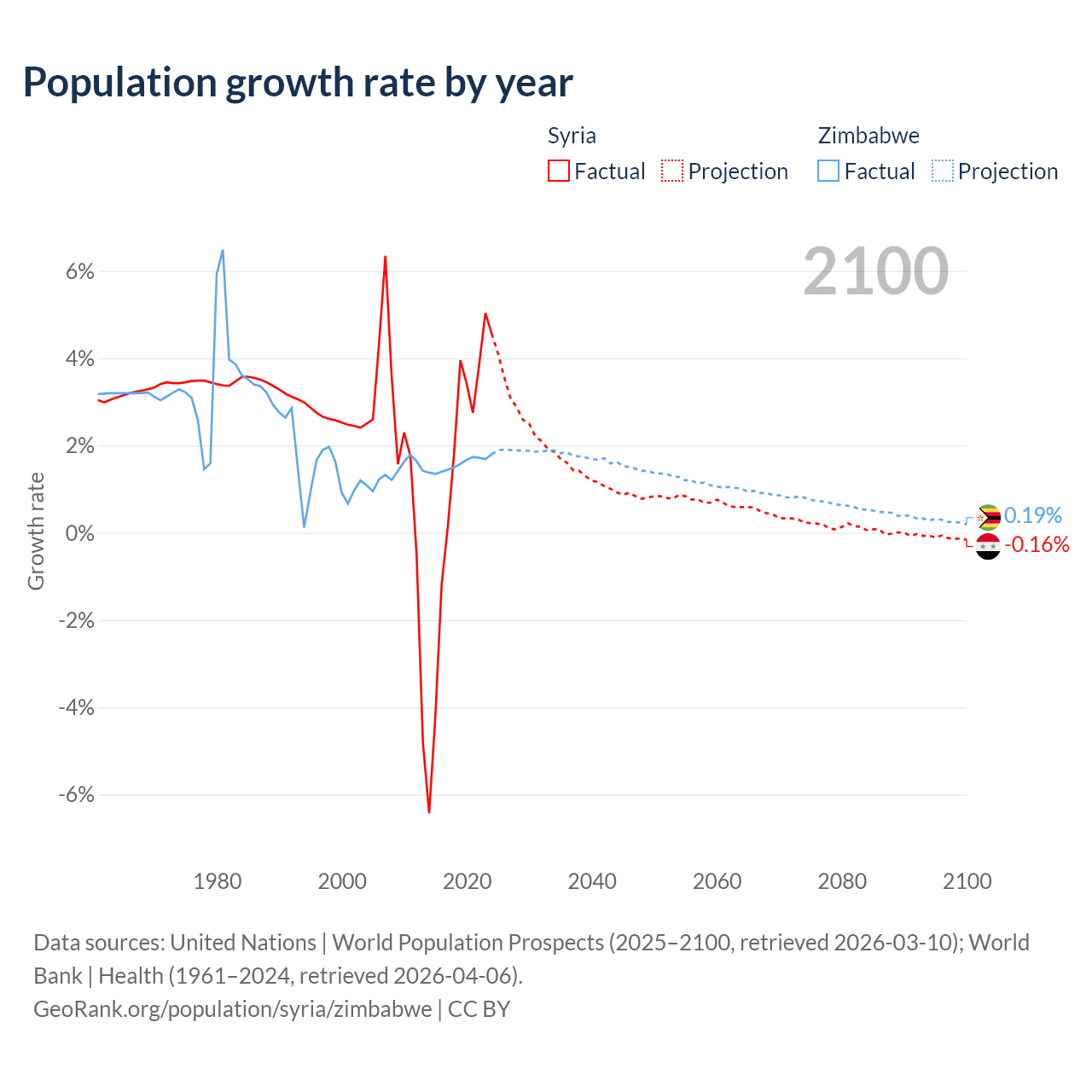 - For the last 10 years, Syria has had an average growth rate of +1.25% per year vs +1.57% in Zimbabwe.