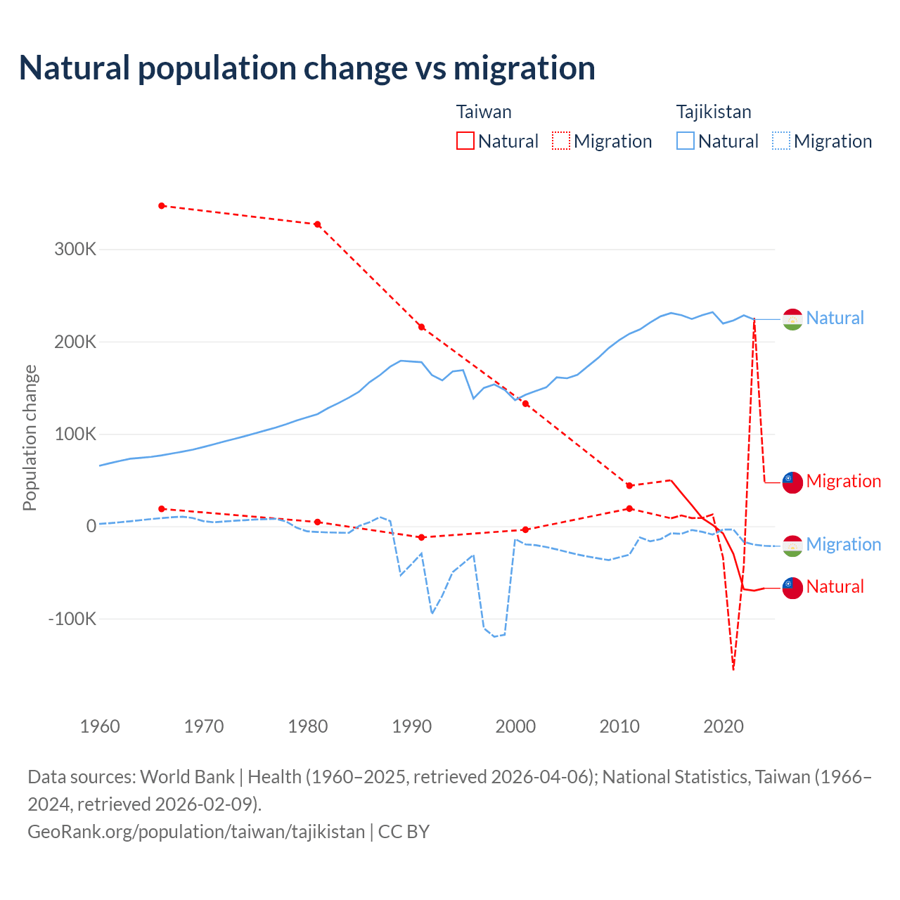 Over the last 10 years, 56.7% of the population change in Taiwan is from natural causes (a loss of 57,467 people) and 43.3% is from migration (a gain of 43,884 people). In Tajikistan 96% is from natural causes (a gain of 2,266,045 people) and 3.95% is from migration (a loss of 93,205 people).