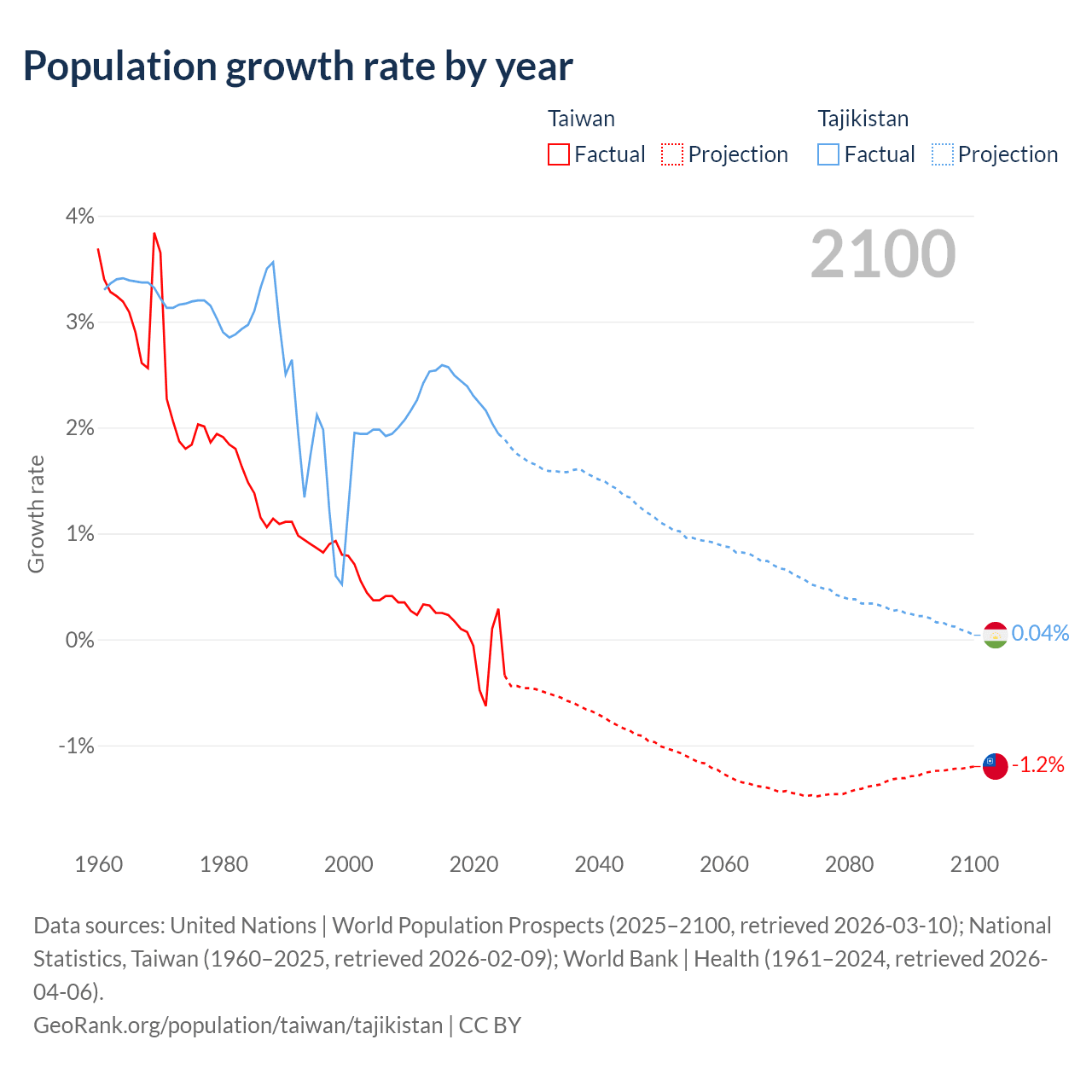 Data sources: World Bank | Health (1960–2024, retrieved 2026-04-06); United Nations | World Population Prospects (1960–2026, retrieved 2026-03-10); U.S. Census Bureau (1960–2025, retrieved 2026-02-08); National Statistics, Taiwan (1960–2025, retrieved 2026-02-09); Central Intelligence Agency (CIA) (2000–2019, retrieved 2026-02-20).