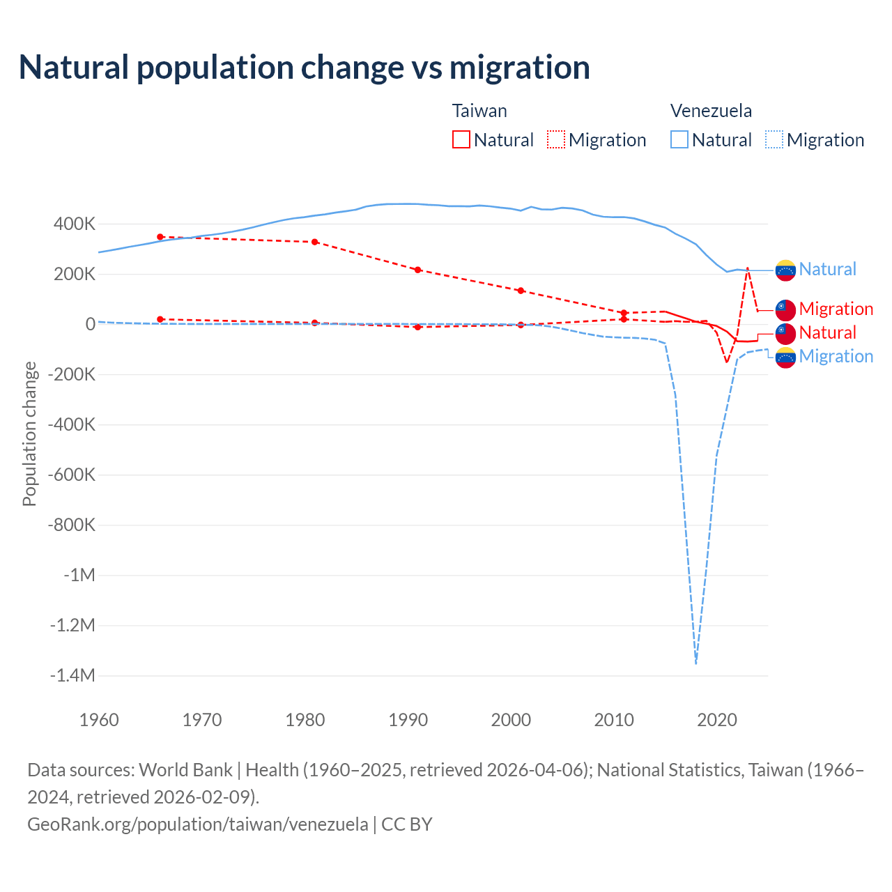 Over the last 10 years, 56.7% of the population change in Taiwan is from natural causes (a loss of 57,467 people) and 43.3% is from migration (a gain of 43,884 people). In Venezuela 38.6% is from natural causes (a gain of 2,946,257 people) and 61.4% is from migration (a loss of 4,683,227 people).