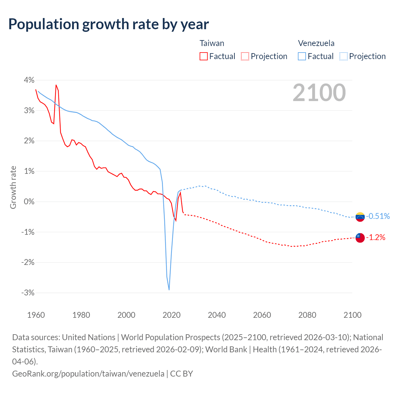 - For the last 10 years, Taiwan has had an average growth rate of -0.03% per year vs -0.46% in Venezuela.
