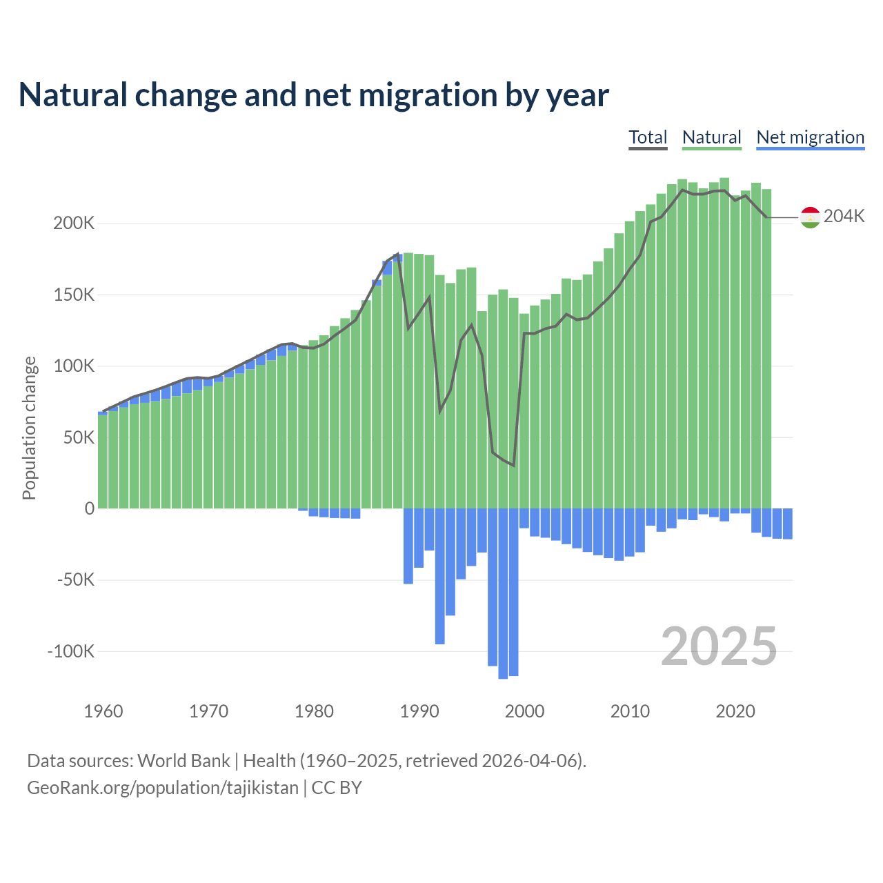 Over the last 10 years, 96% of the population change in Tajikistan is from natural causes (a gain of 2,266,045 people) and 3.95% is from migration (a loss of 93,205 people).