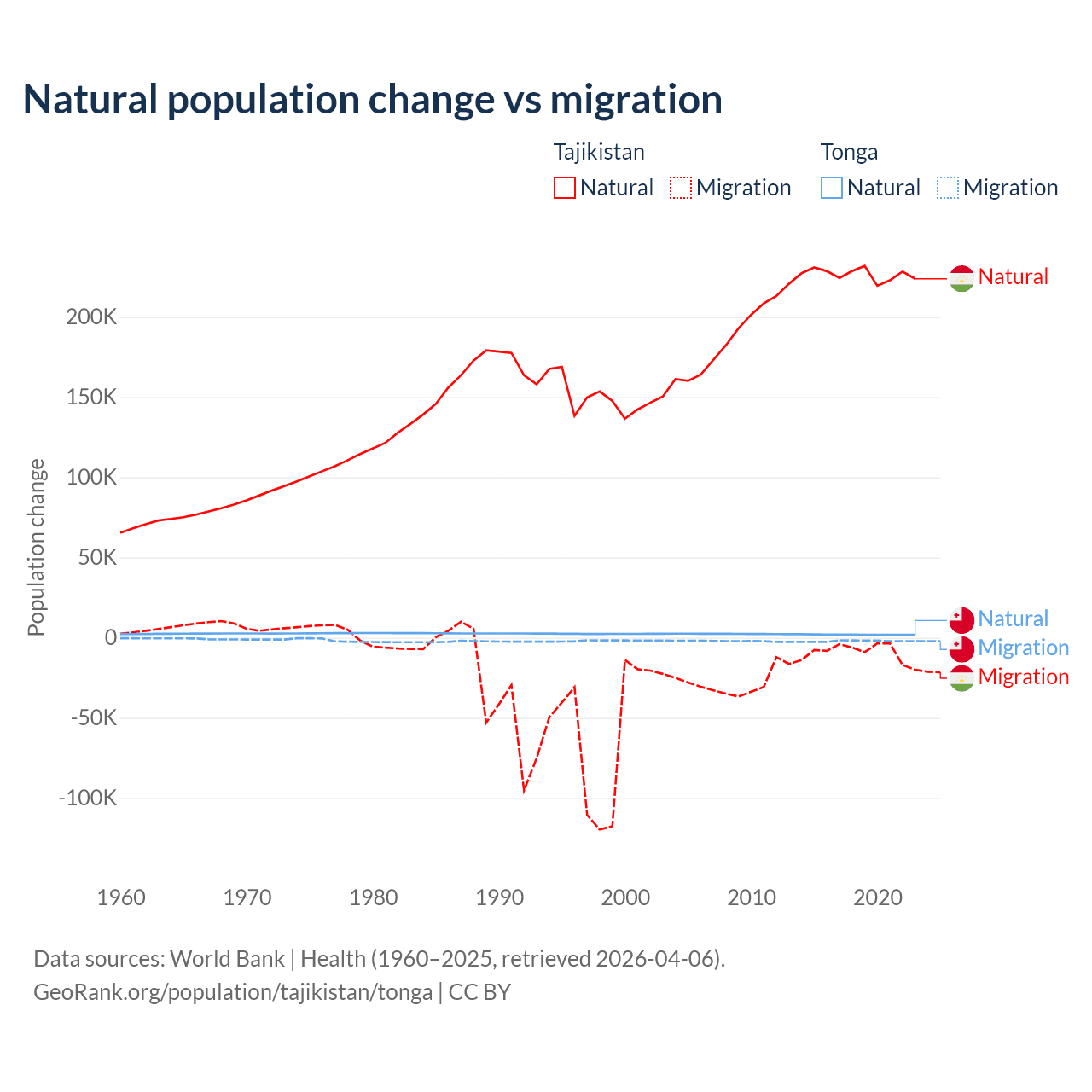 Over the last 10 years, 96% of the population change in Tajikistan is from natural causes (a gain of 2,266,045 people) and 3.95% is from migration (a loss of 93,205 people). In Tonga 46.9% is from natural causes (a gain of 18,919 people) and 53.1% is from migration (a loss of 21,384 people).