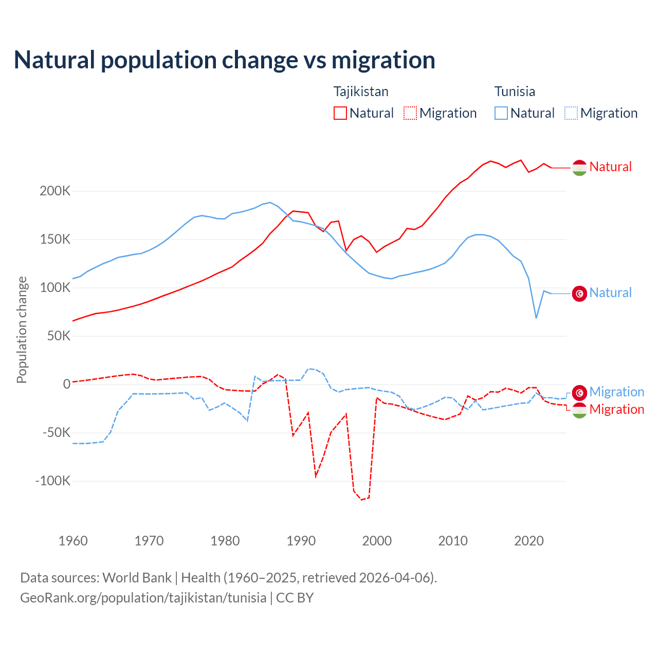 Over the last 10 years, 96% of the population change in Tajikistan is from natural causes (a gain of 2,266,045 people) and 3.95% is from migration (a loss of 93,205 people). In Tunisia 86.3% is from natural causes (a gain of 1,225,079 people) and 13.7% is from migration (a loss of 195,011 people).