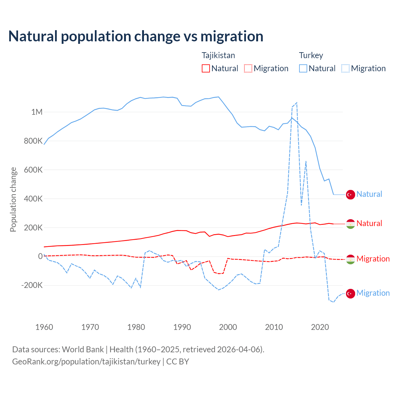 Over the last 10 years, 96% of the population change in Tajikistan is from natural causes (a gain of 2,266,045 people) and 3.95% is from migration (a loss of 93,205 people). In Turkey 73% is from natural causes (a gain of 7,333,352 people) and 27% is from migration (a gain of 2,718,916 people).