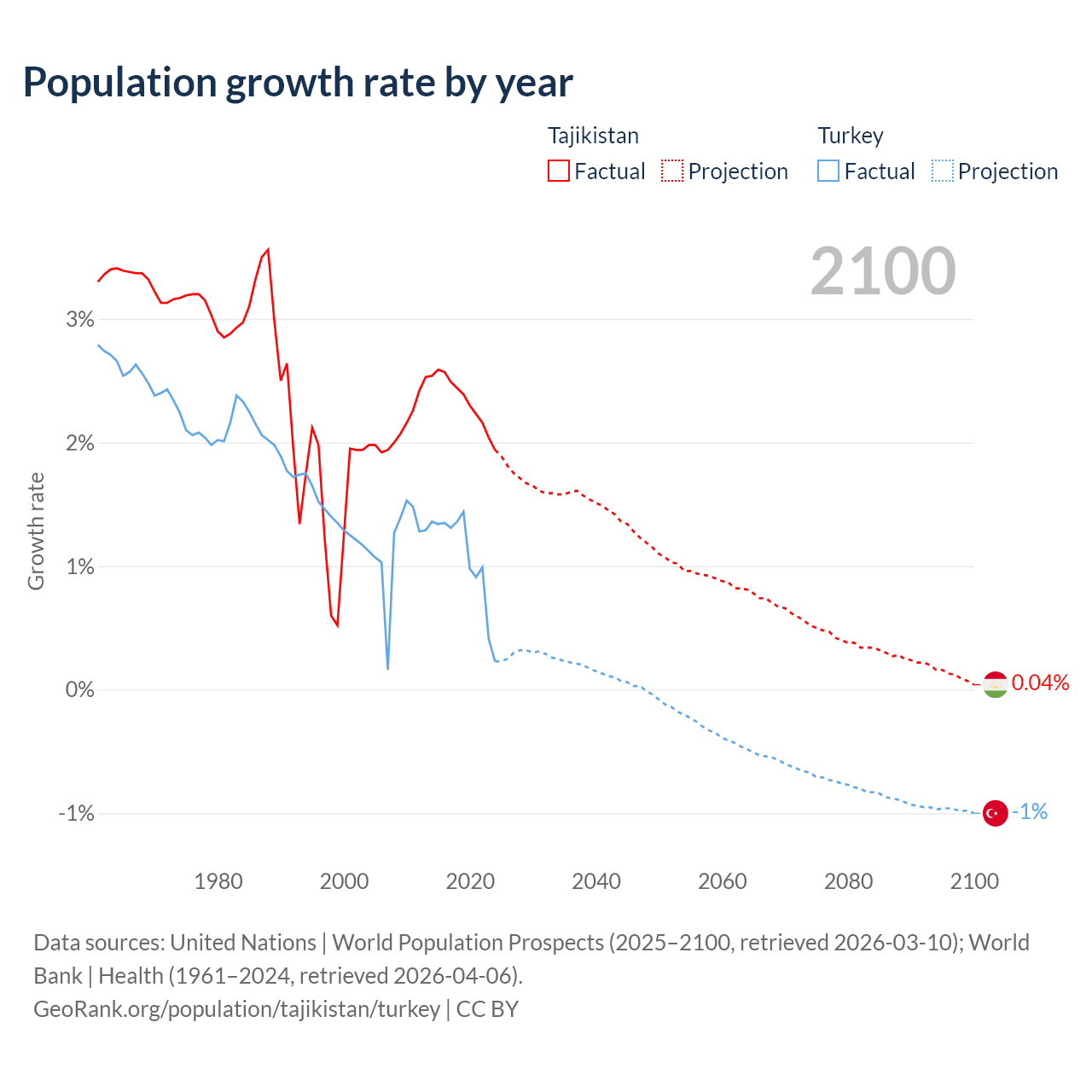 Data sources: World Bank | Health (1960–2024, retrieved 2026-04-06); United Nations | World Population Prospects (1960–2026, retrieved 2026-03-10); U.S. Census Bureau (1960–2025, retrieved 2026-02-08); Central Intelligence Agency (CIA) (2000–2019, retrieved 2026-02-20).
