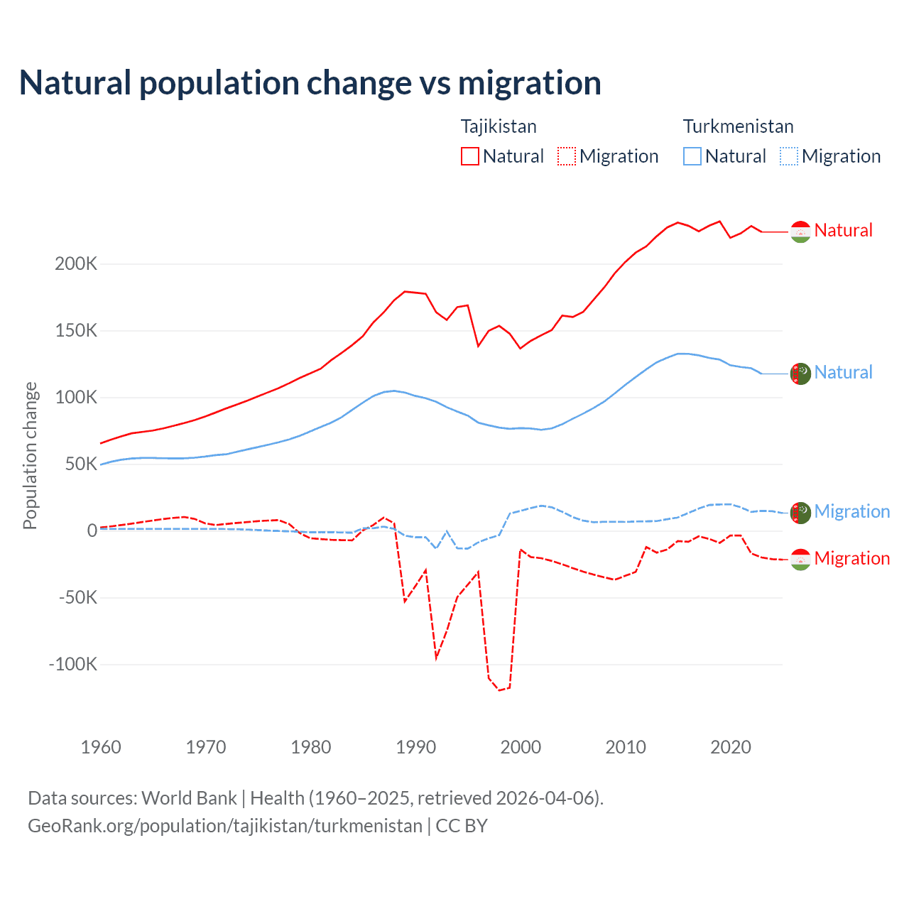 Over the last 10 years, 96% of the population change in Tajikistan is from natural causes (a gain of 2,266,045 people) and 3.95% is from migration (a loss of 93,205 people). In Turkmenistan 89.2% is from natural causes (a gain of 1,270,228 people) and 10.8% is from migration (a gain of 154,379 people).