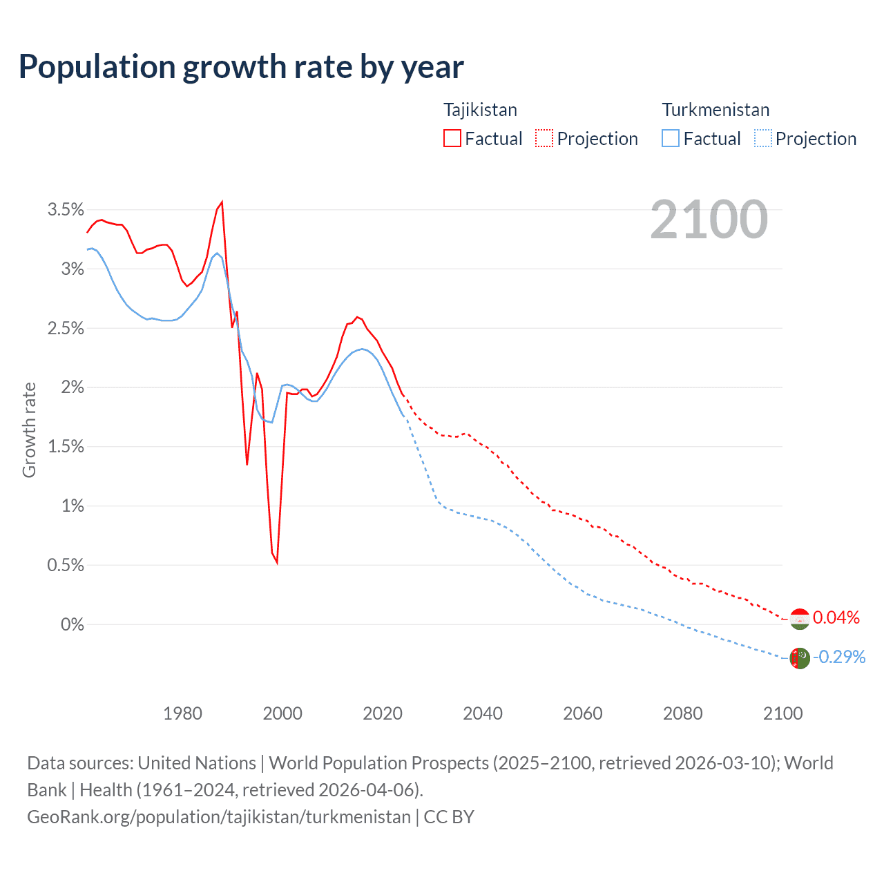 Data sources: World Bank | Health (1960–2024, retrieved 2026-04-06); United Nations | World Population Prospects (1960–2026, retrieved 2026-03-10); U.S. Census Bureau (1960–2025, retrieved 2026-02-08); Central Intelligence Agency (CIA) (2000–2019, retrieved 2026-02-20).