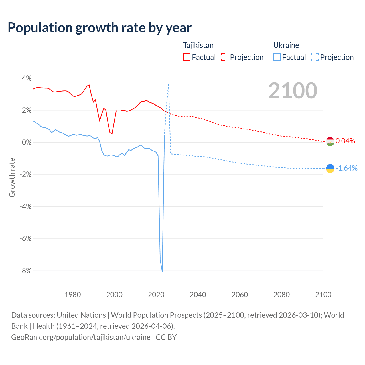 - For the last 10 years, Tajikistan has had an average growth rate of +2.33% per year vs -1.74% in Ukraine.