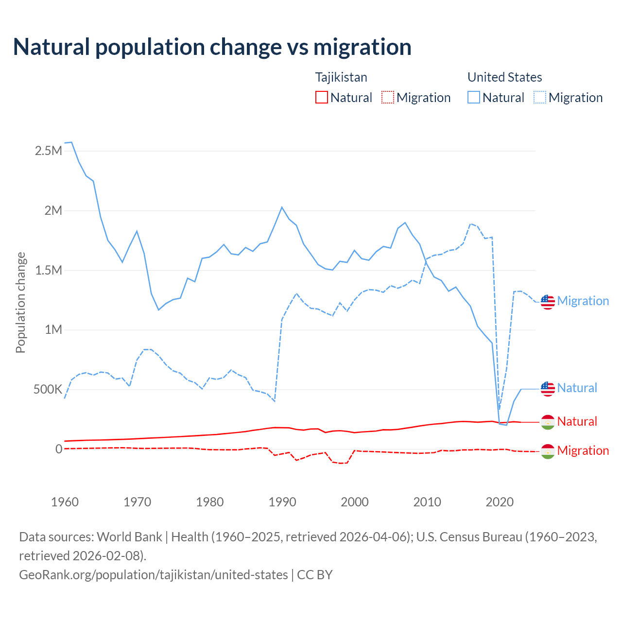 Over the last 10 years, 96% of the population change in Tajikistan is from natural causes (a gain of 2,266,045 people) and 3.95% is from migration (a loss of 93,205 people). In the United States 35.8% is from natural causes (a gain of 8,005,866 people) and 64.2% is from migration (a gain of 14,334,286 people).