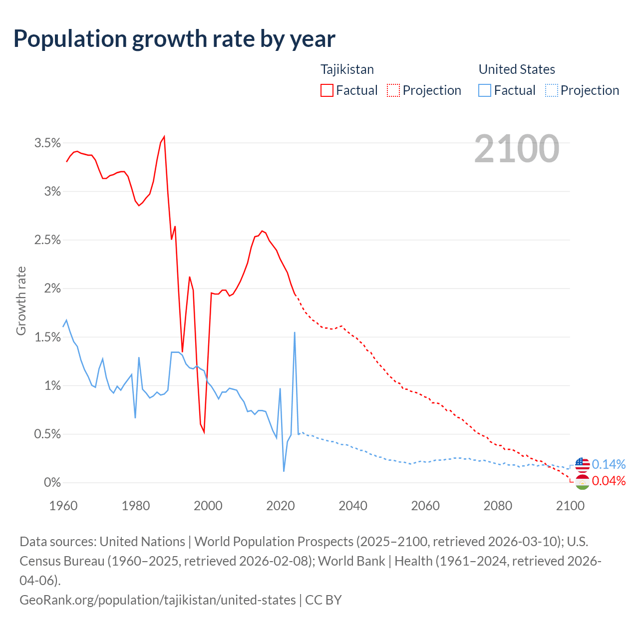 Data sources: World Bank | Health (1960–2024, retrieved 2026-04-06); United Nations | World Population Prospects (1960–2026, retrieved 2026-03-10); U.S. Census Bureau (1960–2025, retrieved 2026-02-08); Central Intelligence Agency (CIA) (2000–2019, retrieved 2026-02-20).