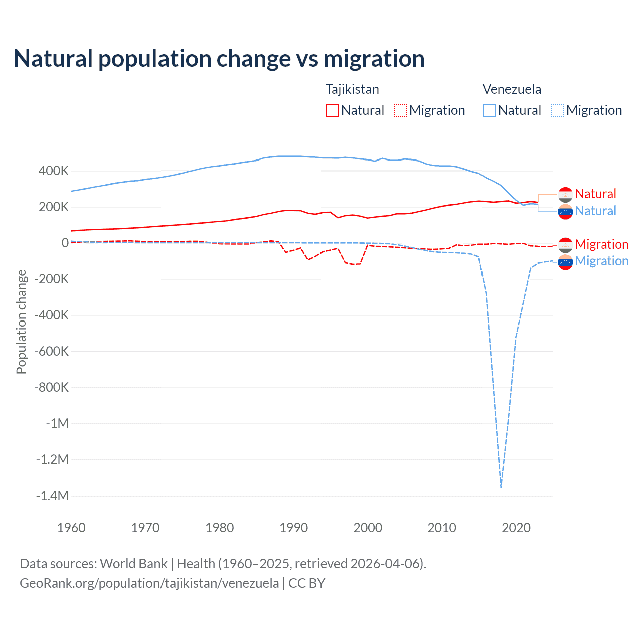 Over the last 10 years, 96% of the population change in Tajikistan is from natural causes (a gain of 2,266,045 people) and 3.95% is from migration (a loss of 93,205 people). In Venezuela 38.6% is from natural causes (a gain of 2,946,257 people) and 61.4% is from migration (a loss of 4,683,227 people).