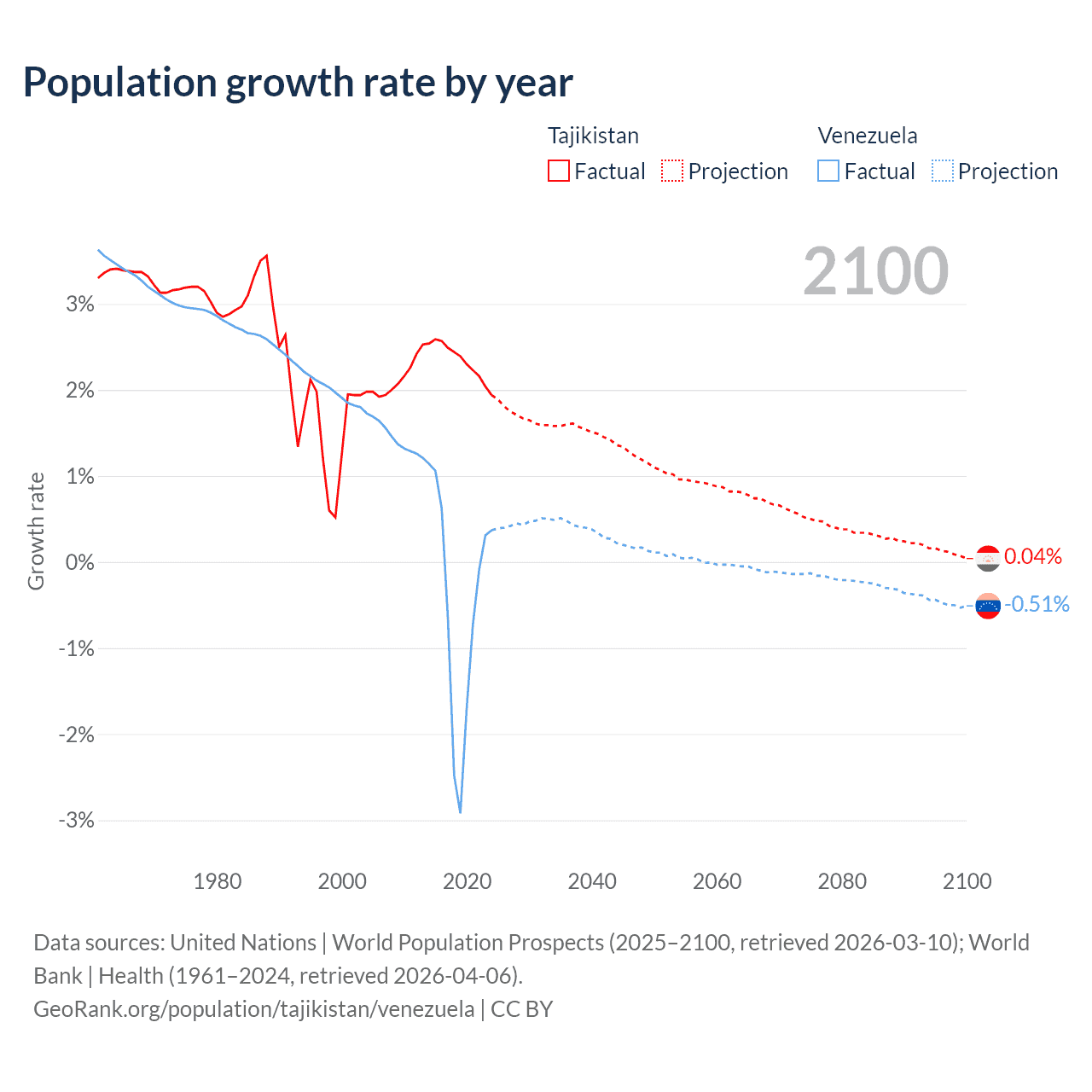 Data sources: World Bank | Health (1960–2024, retrieved 2026-04-06); United Nations | World Population Prospects (1960–2026, retrieved 2026-03-10); U.S. Census Bureau (1960–2025, retrieved 2026-02-08); Central Intelligence Agency (CIA) (2000–2019, retrieved 2026-02-20).