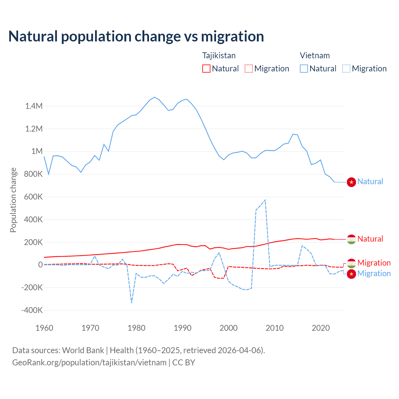 Over the last 10 years, 96% of the population change in Tajikistan is from natural causes (a gain of 2,266,045 people) and 3.95% is from migration (a loss of 93,205 people). In Vietnam 97.7% is from natural causes (a gain of 9,349,756 people) and 2.29% is from migration (a gain of 219,073 people).