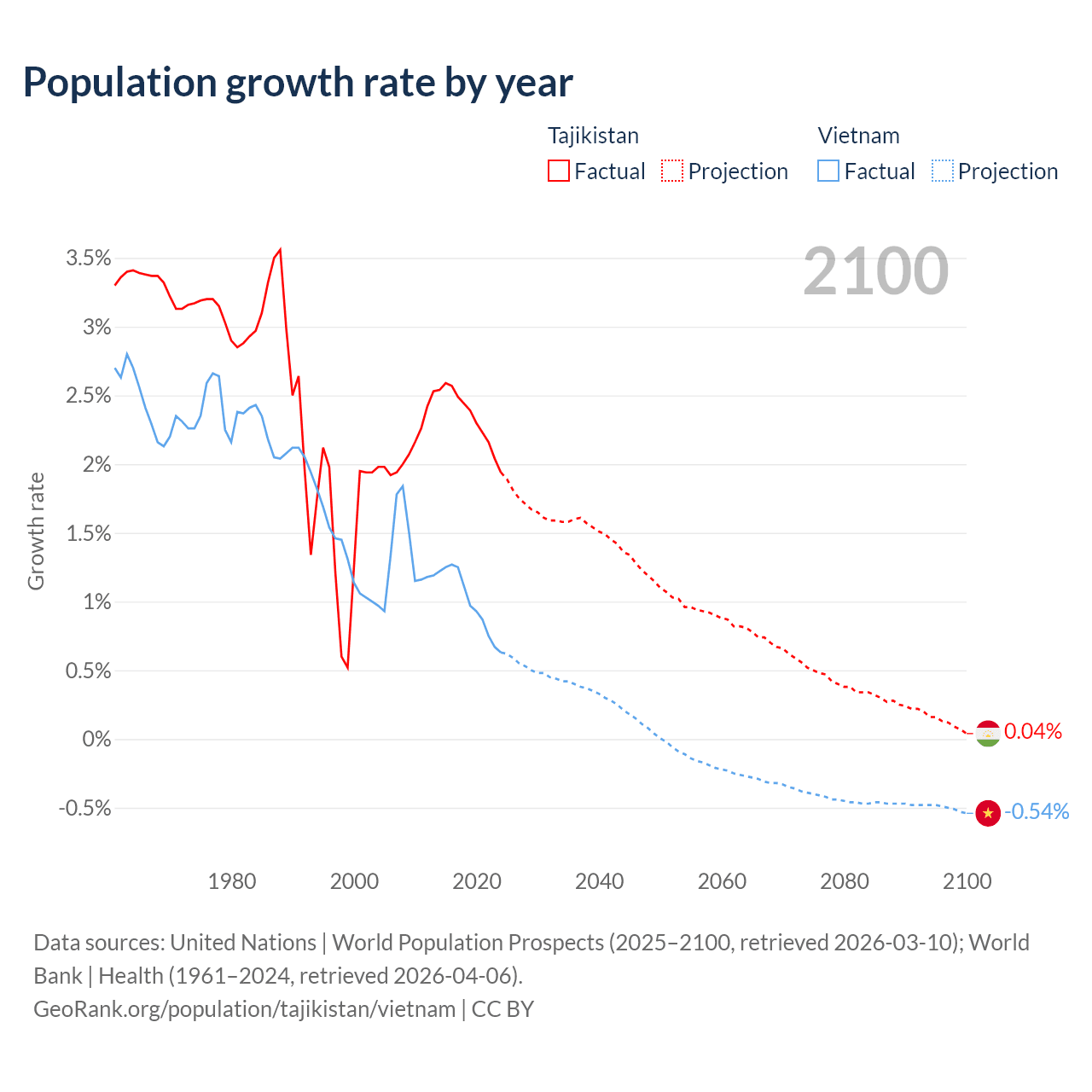 Tajikistan vs Vietnam: population by year and forecast