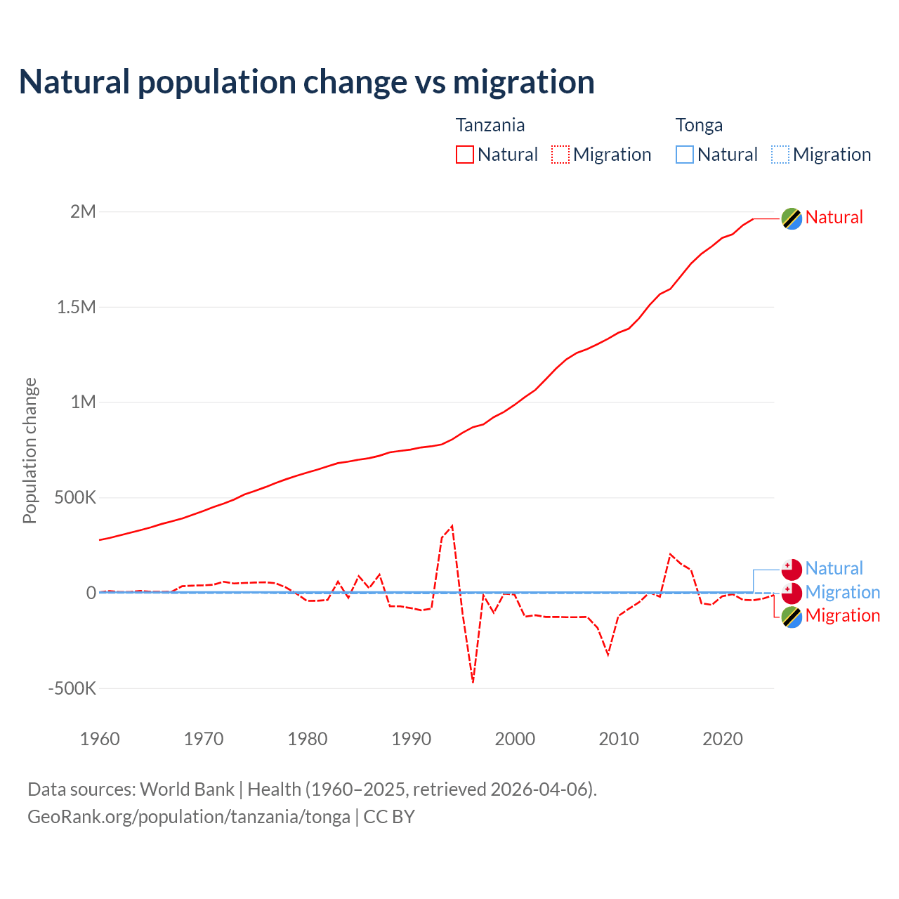 Over the last 10 years, 98.7% of the population change in Tanzania is from natural causes (a gain of 17,769,541 people) and 1.27% is from migration (a gain of 229,466 people). In Tonga 46.9% is from natural causes (a gain of 18,919 people) and 53.1% is from migration (a loss of 21,384 people).