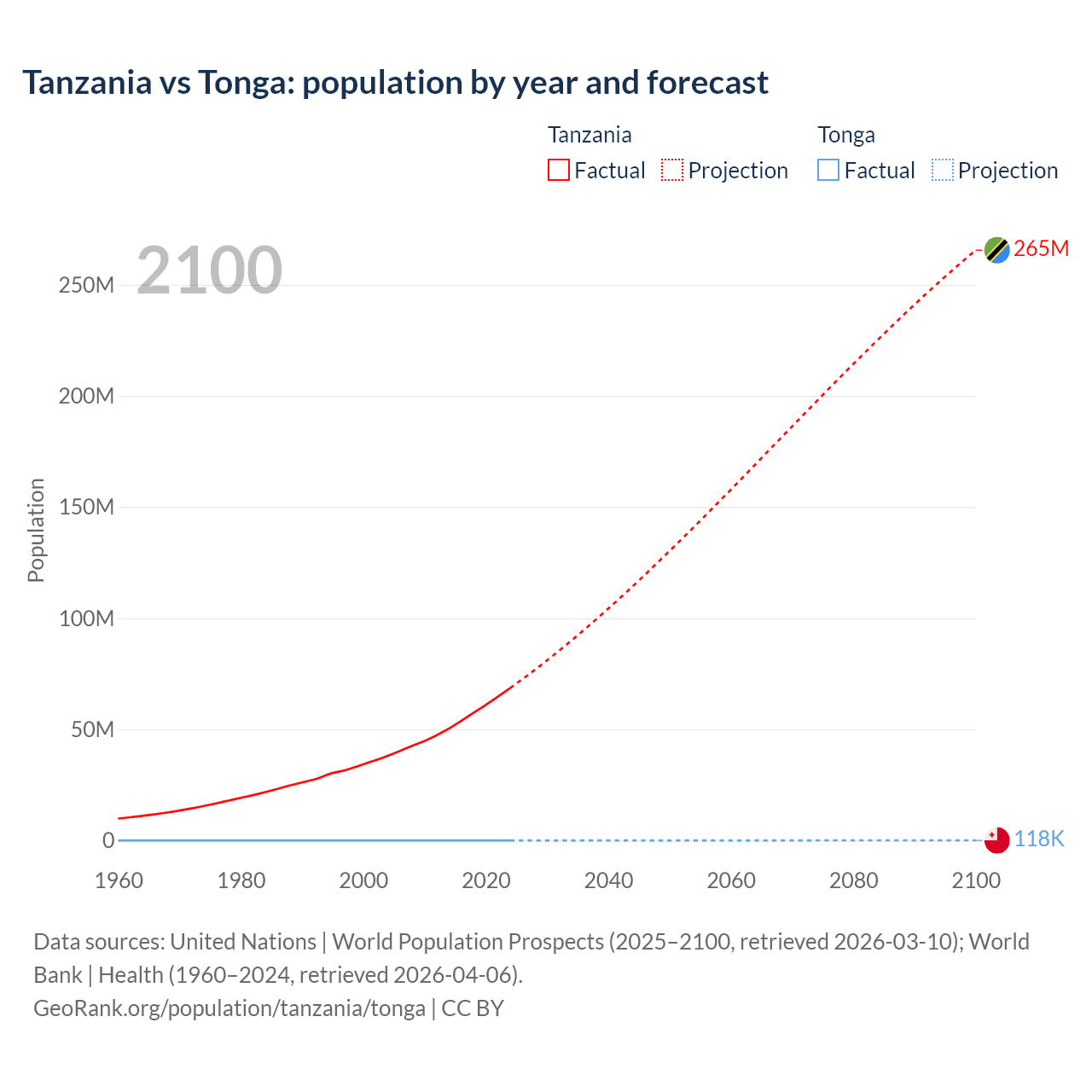 Tanzania vs Tonga: population by year and forecast