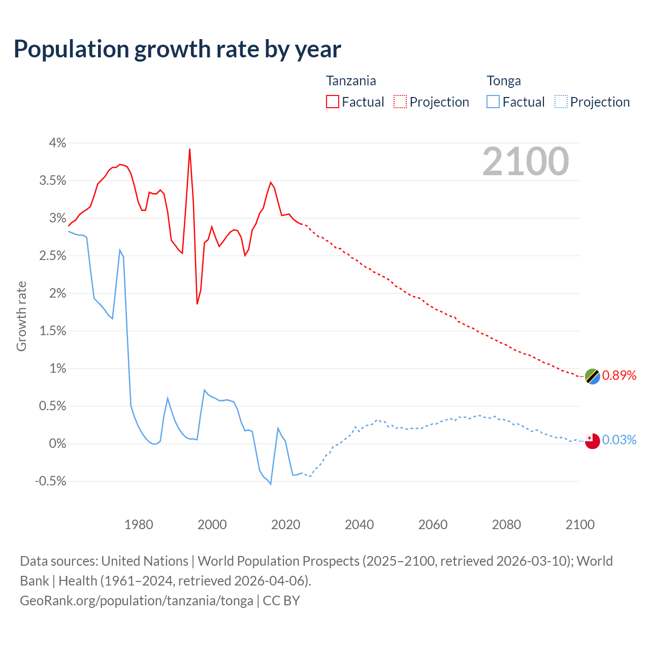 - For the last 10 years, Tanzania has had an average growth rate of +3.13% per year vs -0.25% in Tonga.