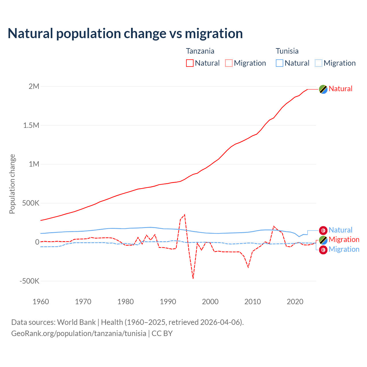 Over the last 10 years, 98.7% of the population change in Tanzania is from natural causes (a gain of 17,769,541 people) and 1.27% is from migration (a gain of 229,466 people). In Tunisia 86.3% is from natural causes (a gain of 1,225,079 people) and 13.7% is from migration (a loss of 195,011 people).