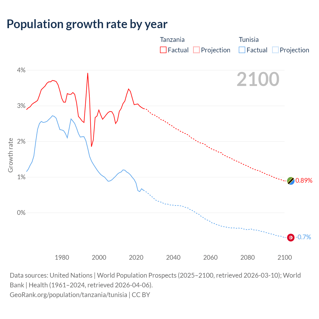 - For the last 10 years, Tanzania has had an average growth rate of +3.13% per year vs +0.89% in Tunisia.