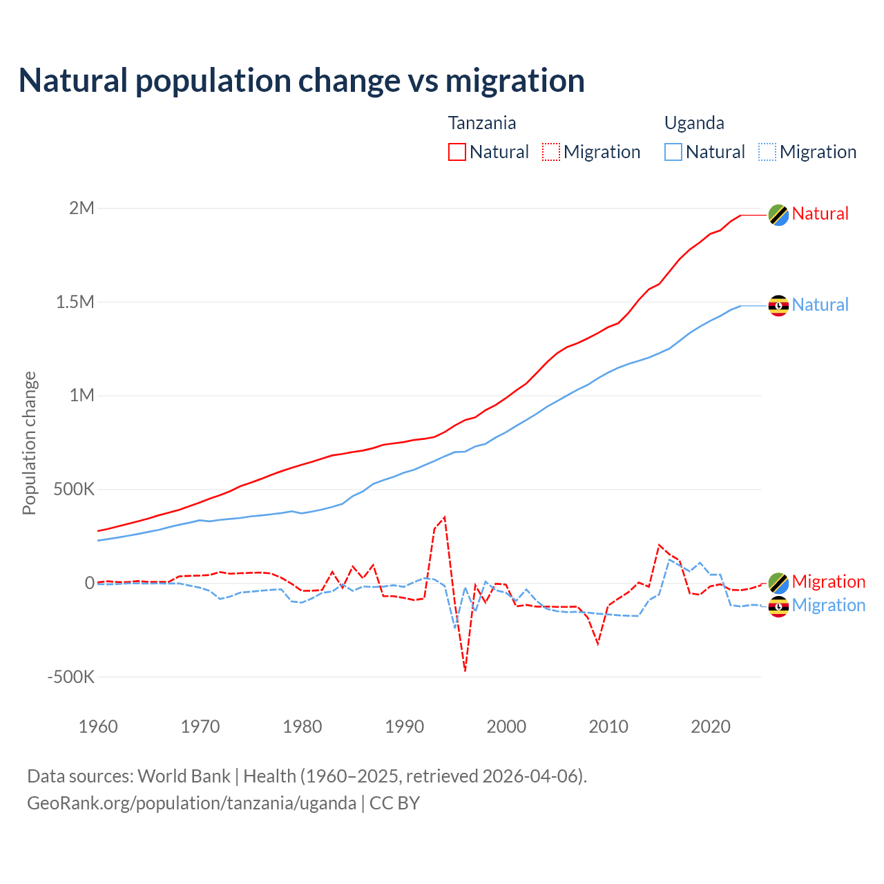 Over the last 10 years, 98.7% of the population change in Tanzania is from natural causes (a gain of 17,769,541 people) and 1.27% is from migration (a gain of 229,466 people). In Uganda 99.5% is from natural causes (a gain of 13,419,712 people) and 0.53% is from migration (a gain of 71,457 people).