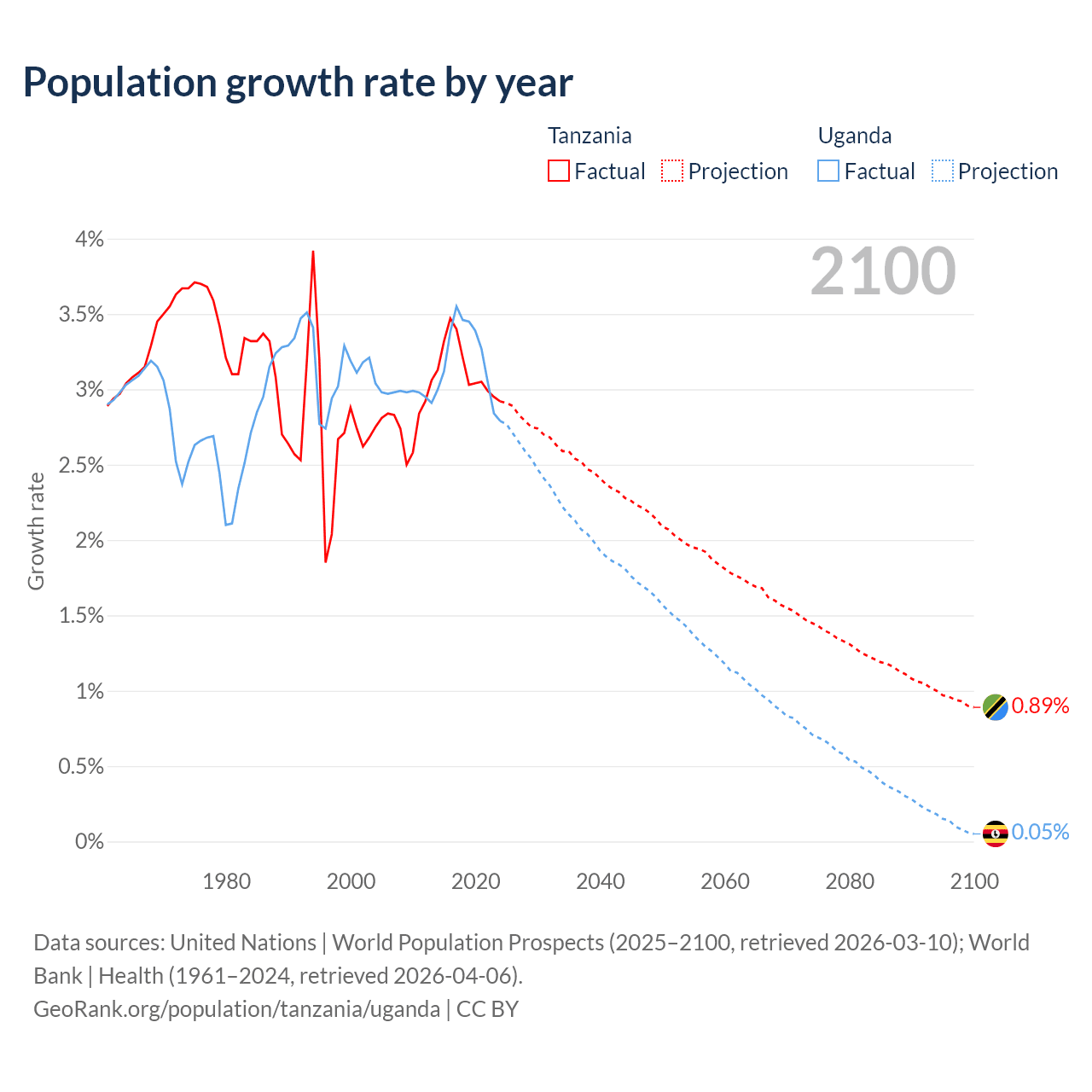 - For the last 10 years, Tanzania has had an average growth rate of +3.13% per year vs +3.21% in Uganda.